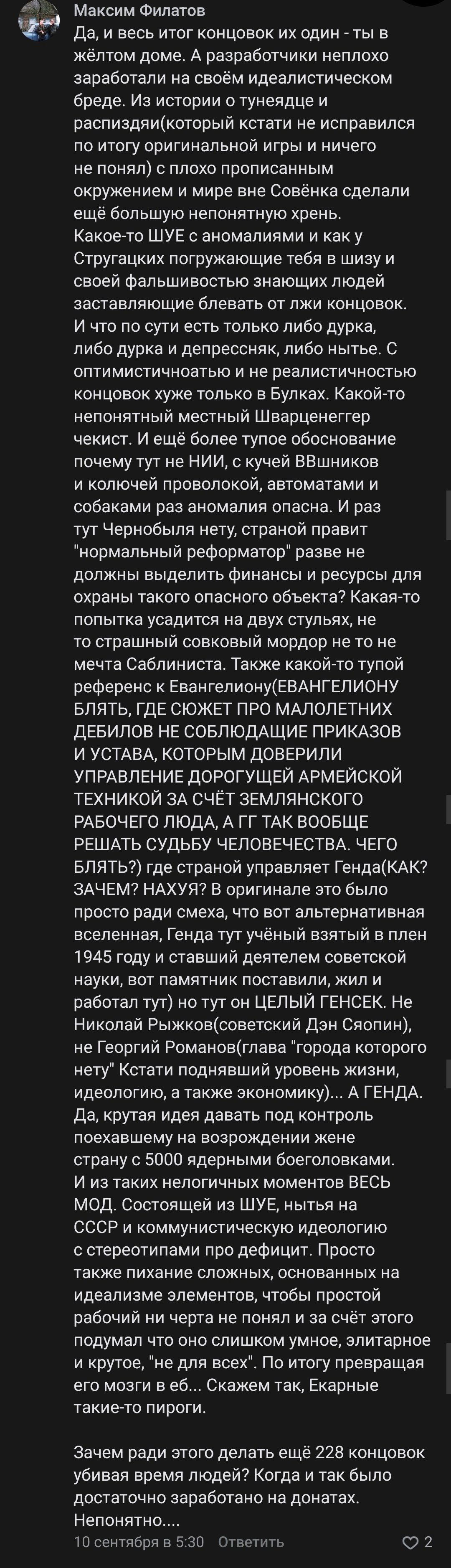 >>1216019 Да, и весь итог концовок их один - ты в жёлтом доме. А разработчики неплохо заработали на своём идеалистическом бреде. Из истории о тунеядце и распиздяи(который кстати не исправился по итогу оригинальной игры и ничего не понял) с плохо прописанным окружением и мире вне Совёнка сделали ещё большую непонятную хрень. Какое-то ШУЕ с аномалиями и как у Стругацких погружающие тебя в шизу и своей фальшивостью знающих людей заставляющие блевать от лжи концовок. И что по сути есть только либо дурка, либо дурка и депрессняк, либо нытье. С оптимистичноатью и не реалистичностью концовок хуже только в Булках. Какой-то непонятный местный Шварценеггер чекист. И ещё более тупое обоснование почему тут не НИИ, с кучей ВВшников и колючей проволокой, автоматами и собаками раз аномалия опасна. И раз тут Чернобыля нету, страной правит "нормальный реформатор" разве не должны выделить финансы и ресурсы для охраны такого опасного объекта? Какая-то попытка усадится на двух стульях, не то страшный совковый мордор не то не мечта Саблиниста. Также какой-то тупой референс к Евангелиону(ЕВАНГЕЛИОНУ БЛЯТЬ, ГДЕ СЮЖЕТ ПРО МАЛОЛЕТНИХ ДЕБИЛОВ НЕ СОБЛЮДАЩИЕ ПРИКАЗОВ И УСТАВА, КОТОРЫМ ДОВЕРИЛИ УПРАВЛЕНИЕ ДОРОГУЩЕЙ АРМЕЙСКОЙ ТЕХНИКОЙ ЗА СЧЁТ ЗЕМЛЯНСКОГО РАБОЧЕГО ЛЮДА, А ГГ ТАК ВООБЩЕ РЕШАТЬ СУДЬБУ ЧЕЛОВЕЧЕСТВА. ЧЕГО БЛЯТЬ?) где страной управляет Генда(КАК? ЗАЧЕМ? НАХУЯ? В оригинале это было просто ради смеха, что вот альтернативная вселенная, Генда тут учёный взятый в плен 1945 году и ставший деятелем советской науки, вот памятник поставили, жил и работал тут) но тут он ЦЕЛЫЙ ГЕНСЕК. Не Николай Рыжков(советский Дэн Сяопин), не Георгий Романов(глава "города которого нету" Кстати поднявший уровень жизни, идеологию, а также экономику)... А ГЕНДА. Да, крутая идея давать под контроль поехавшему на возрождении жене страну с 5000 ядерными боеголовками. И из таких нелогичных моментов ВЕСЬ МОД. Состоящей из ШУЕ, нытья на СССР и коммунистическую идеологию с стереотипами про дефицит. Просто также пихание сложных, основанных на идеализме элементов, чтобы простой рабочий ни черта не понял и за счёт этого подумал что оно слишком умное, элитарное и крутое, "не для всех". По итогу превращая его мозги в еб... Скажем так, Екарные такие-то пироги.