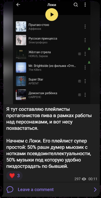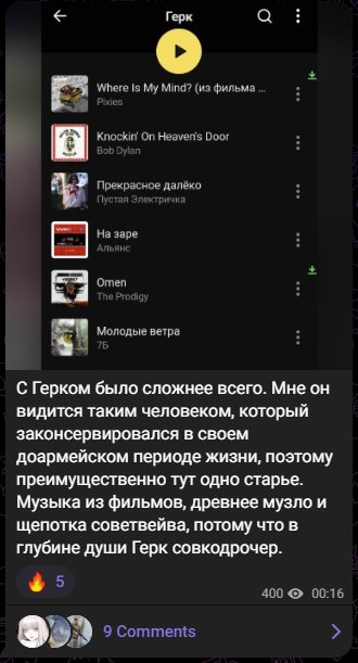 >>1221617 Да по такому случаю можно всем тредом составить базированные плейлисты ко всем героям Пива, а то по мнению автор_ки сценария, консерватóрский музыкант слушает песни с пик1. Пиздец просто.
