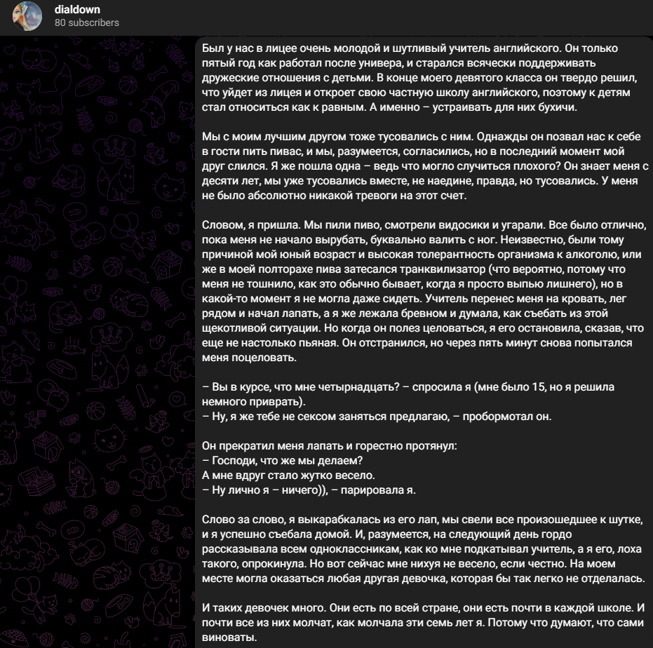 >>1222477 Бывает и хуже. В большинстве случаев сексуальное насилие исходит от семьи и ближайшего окружения, вот это реально пиздец, потому что сбежать нельзя. А в моем случае похотливый хуйлуша мало того, что самоустранился, так еще и страшно очковал, что эта история всплывет. До окончания школы любила подловить его на улке (если удавалось, обычно он при виде меня оперативно съебывал) и с ехидной улыбкой стрельнуть у него сижку. С видом "я сдам тебя, дружок-пирожок, только рыпнись" Да и в принципе я сейчас его не деаноню только потому, что пруфов не осталось