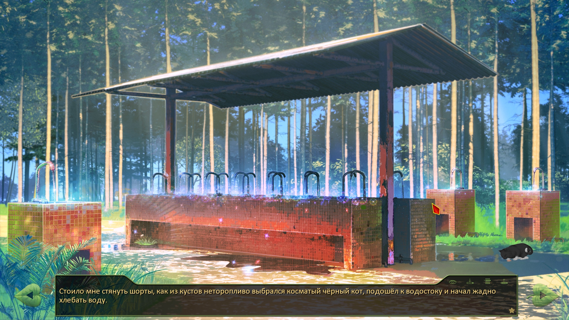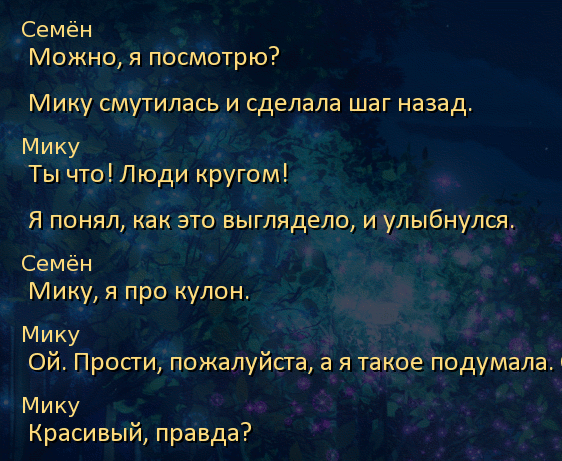 un "А ты не знаешь, куда Шурик пошёл?" un "Шёл к лесу и бормотал что-то под нос. Я его позвала, а он даже не повернулся. {w}Лунатик, что ли?" me "Был бы лунатик — в трусах гулял бы. {w}Я его тоже видел." me "Не бери в голову. Наверное, девочка у него, будут держаться за руки, смотреть на звёзды и по-пионерски целоваться в щёчку. {w}Даже завидно."