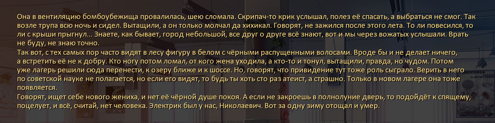 Мне порой кажется, что всё стоило закончить вовсе на сцене в старом лагере. После неё мод свернул куда-то не туда. Демонизация Шурика, который внезапно стал зоосадистом, мучившим Пирата, и устраивающим дебоши. БогоЛена с нихуя. Кринж ветка с Пионером. Нахуй добавлять потужную интригу и триллер в добрый мод, который всей своей атмосферой показывает, что всё будет хорошо, и ничего плохого не случится. И апофеоз кринжа, концерт уровня школомодов. Хотя, если бы Сёма в итоге вернулся к двачеванию(помните, когда Маша бежит за ним в слезах, а он уезжает), то финал был бы неплохим. Сильным и драматичным.