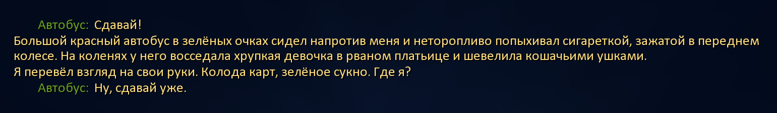 bus "Сдавай!" "Большой красный автобус в зелёных очках сидел напротив меня и неторопливо попыхивал сигареткой, зажатой в переднем колесе. {w}На коленях у него восседала хрупкая девочка в рваном платьице и шевелила кошачьими ушками." "Я перевёл взгляд на свои руки. Колода карт, зелёное сукно. {w}Где я?" bus "Ну, сдавай уже."
