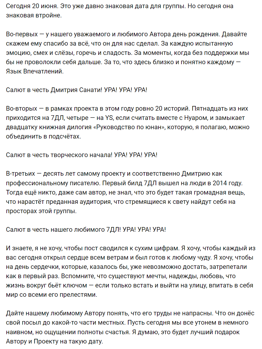 Это все инерция старого буста популярности лета. 7ДЛ в нем и находится, как и ЛМР. Чтобы достичь хотя бы 1/2 того, что было, нужен просто качественно другой уровень - и количественно и качественно. Примерно как ЭОН, существующий пока только в маняфантазиях эрогеев. Другие запросы аудитории уже воплотили в модах за 10 лет и сомнительно, что у риточки хватит мозгов дать что-то новое. Если сомневаетесь - вон ЛМР, можно ознакомиться...