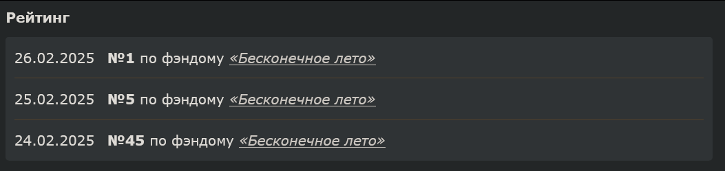 >>1257213 Если есть идеи и желание - пиши в любом случае. Может кому то не понравится, а кому то может и понравитсч. И он еще долго будет вспоминать. Главное - не удаляй ни в коем случее, как бы тебе не было стыдно и грустно, даже в будущем, когда твой скилл подрастет до невиданных высот. Серьезно тебе говорю. Так ты спасешь нервы десяткам людей, у которых с твоей работой ыозможно будут связаны теплые воспоминания с твоим фиком, а онм в какой то момент не смогут его перечиатьь просто потому что ты его делитнул. Не делай так. Ну а если нет настроения писать дальше - не мучай клавиатуру и мозг. Кстати, есть у кого из анонов фанфик "Перекресток"?