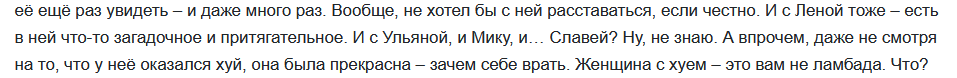 >>1232381 Секс будет только в упоминаниях, типа "а потом мы поебалися, но как, вам знать не обязательно". Я не очень люблю писать про секс. Заниматься им гораздо интереснее