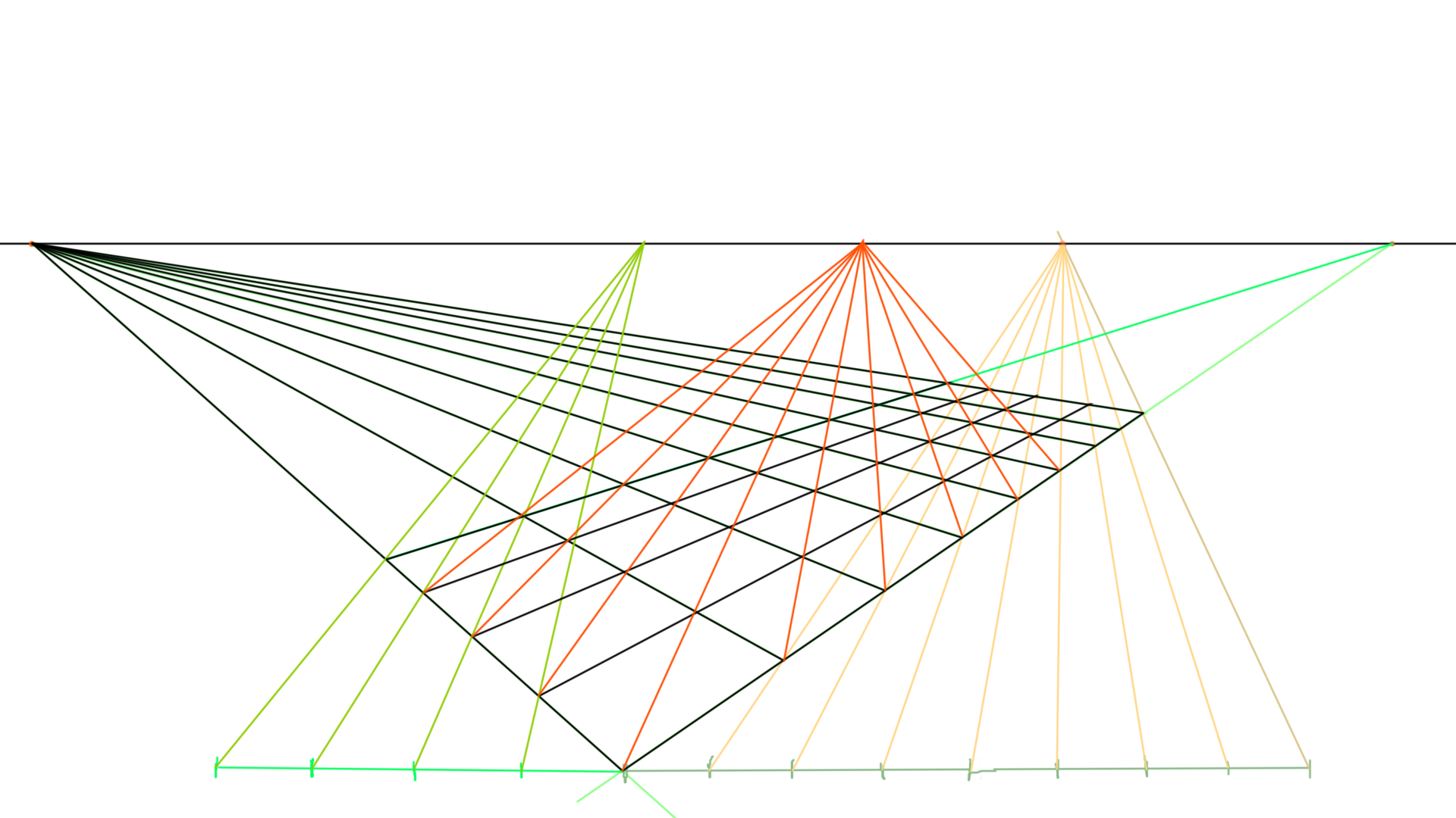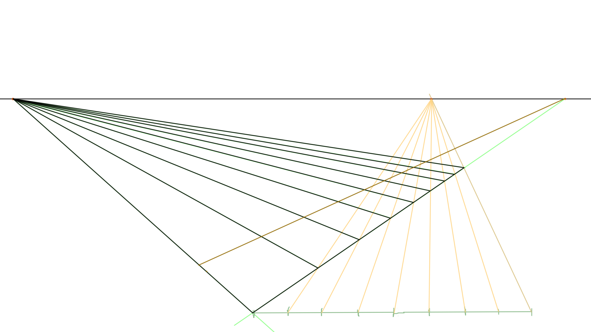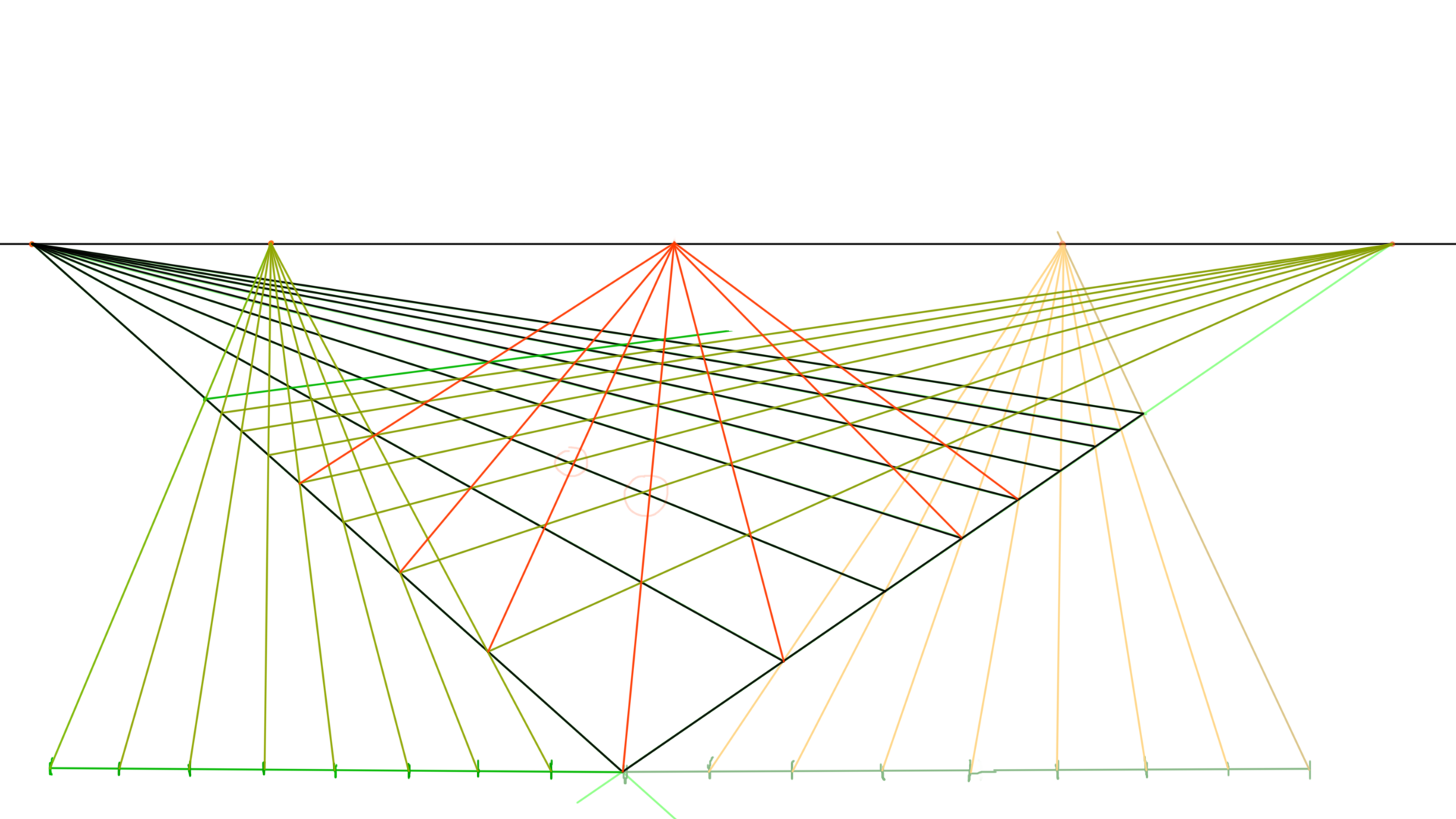 >Ты делишь квадрат не просто глазом, а глазом и нарисованной справа зелёной линейкой в пересечении делимой плоскости от жёлтых лучей до противоположной точке на горизонте. >То есть одинаковый размер для всех искажённых перспективой квадратов задаётся именно через зелёную линейку. Тут честно мозг не понял. Отразить нижнюю линейку влево?