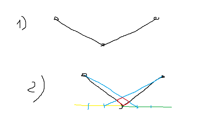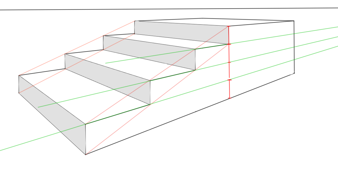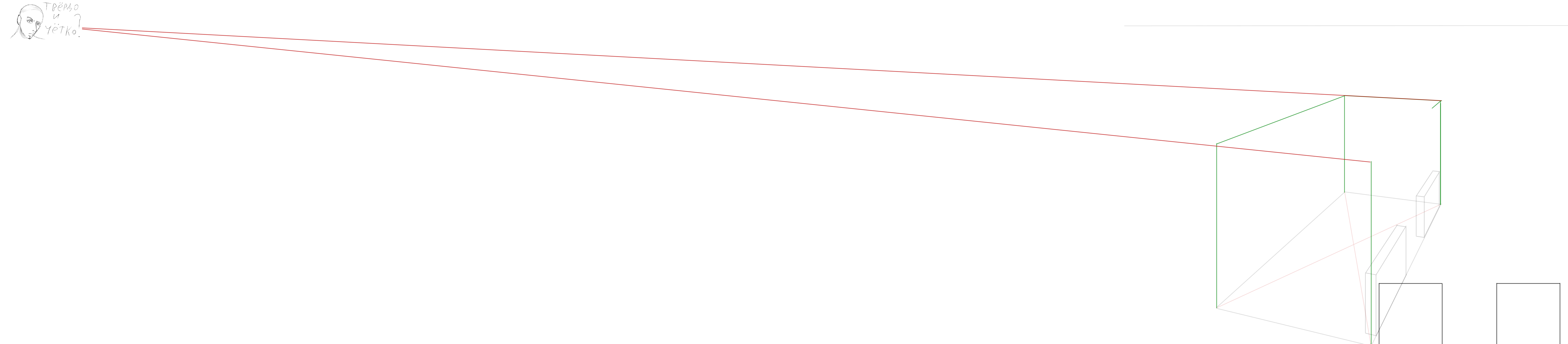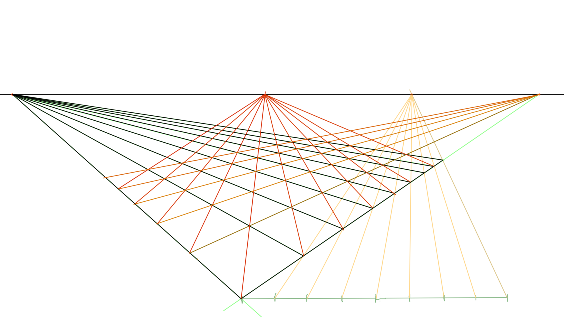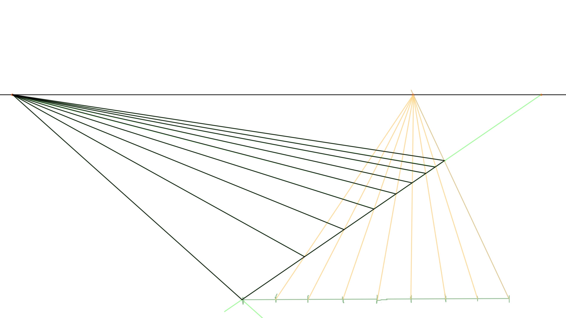 >Ты делишь квадрат не просто глазом, а глазом и нарисованной справа зелёной линейкой в пересечении делимой плоскости от жёлтых лучей до противоположной точке на горизонте. >То есть одинаковый размер для всех искажённых перспективой квадратов задаётся именно через зелёную линейку. Тут честно мозг не понял. Отразить нижнюю линейку влево?
