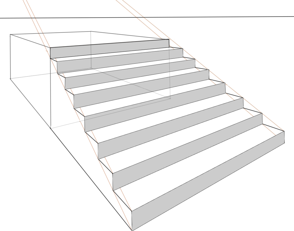 >>1239744 Да вроде нигде, но ты вышел за пределы двухточечной перспективы, из-за того, что одна точка схода очень близко и отсутствует перспективное искажения по вертикали, твои квадратные формы стали прямоугольниками, а прямые углы "вывернулись" - на верхней гране ближний угол слишком тупой, а на нижней слишком острый. Либо двигай левую точку дальше по горизонту, либо добавь третью точку схода снизу.