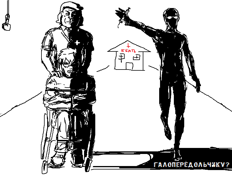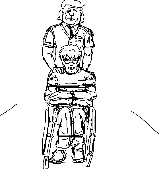Ладно, раз о качко-футанари Ульяне остаётся только мечтать, тогда вот такой вариант - облачённого в робу для буных психов Семёна, кричащего что-то про циклы и альтернативные лагеря, увозят на каталке Шурик с Электроником