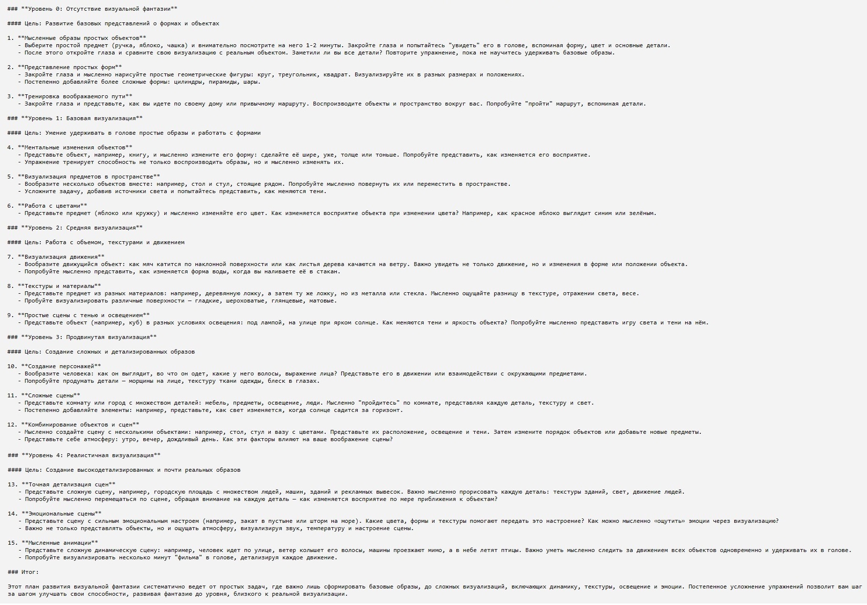 Осознанное творчество: Сильная визуальная фантазия позволяет создавать уникальные образы, комбинируя реальные объекты и воображаемые формы. Это открывает двери к оригинальному художественному самовыражению.