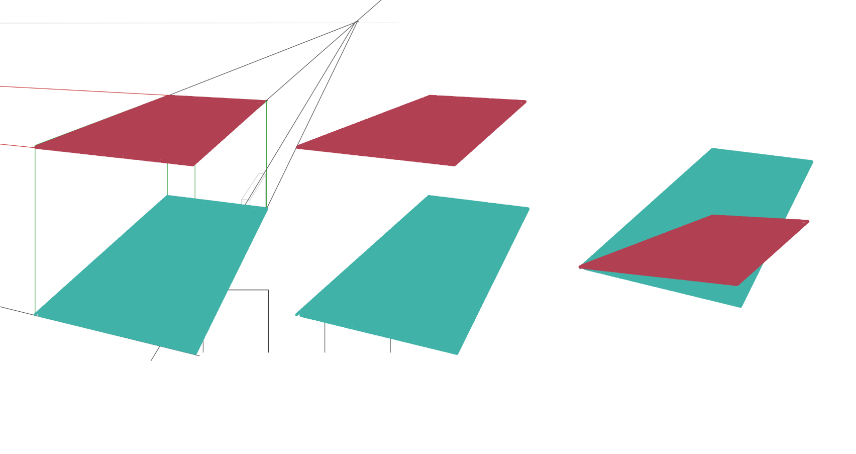 >>1234632 В первой итерации мы задаём плоскость тремя точками, две из которых на горизонте. Во второй мы задаём красный квадрат на пересечении голубых линий, которые проведены от точки на линейке до точки на горизонте.