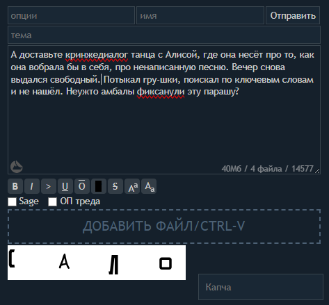 А доставьте кринжедиалог танца с Алисой, где она несёт про то, как она вобрала бы в себя, про ненаписанную песню. Хочу над ним тож поколдовать. Вечер снова выдался свободный. Потыкал rpy-шки, поискал по ключевым словам и не нашёл. Неужто амбалы фиксанули эту парашу? салотор, тебе привет от капчи, кста