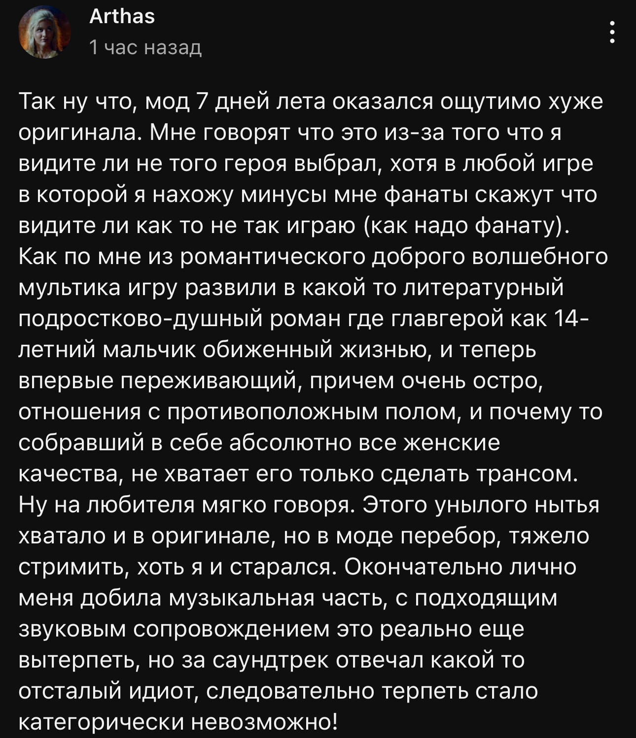 Я вот кстати уже какое то время пиво перепрохожу и вышло так что я как раз сейчас как и жопич славю классик проходил. Пиздец конечно я типа к разному кринжу привык и накал драмы читать могу норм но вот эти бесконечные сны в сливе классик это просто жесть даже я человек который пьет пиво годами буквально и у меня наверное тысячи 2 часов наиграно в лето половина из которых в пиве не могу эти сны читать и воспринимать просто стараюсь как можно быстрее прочесть не особо вообще воспринимая че там написано иногда даже просто скипая. Это буквально худший момент всей новеллы наверное
