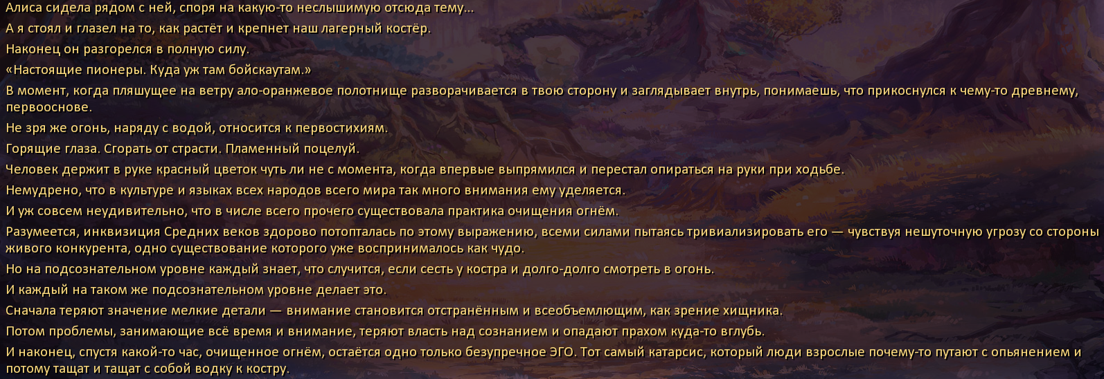 Ну какое же унылое говно эта "адская" ночь в лене-фз. Увидел новую цг и решил пройти, ожидая хотя бы прямую стычку вожатой и Леночки за право присесть на писик бывшего, а в итоге эта мерзкая женщина в лесу арматурину нашла. Абсолютно не понял, почему после произошедшего на Герка накидывают чувство вины, а в конце и сам мажорик смеет обвинять его в случившимся, ну это блять нечитаемый бред