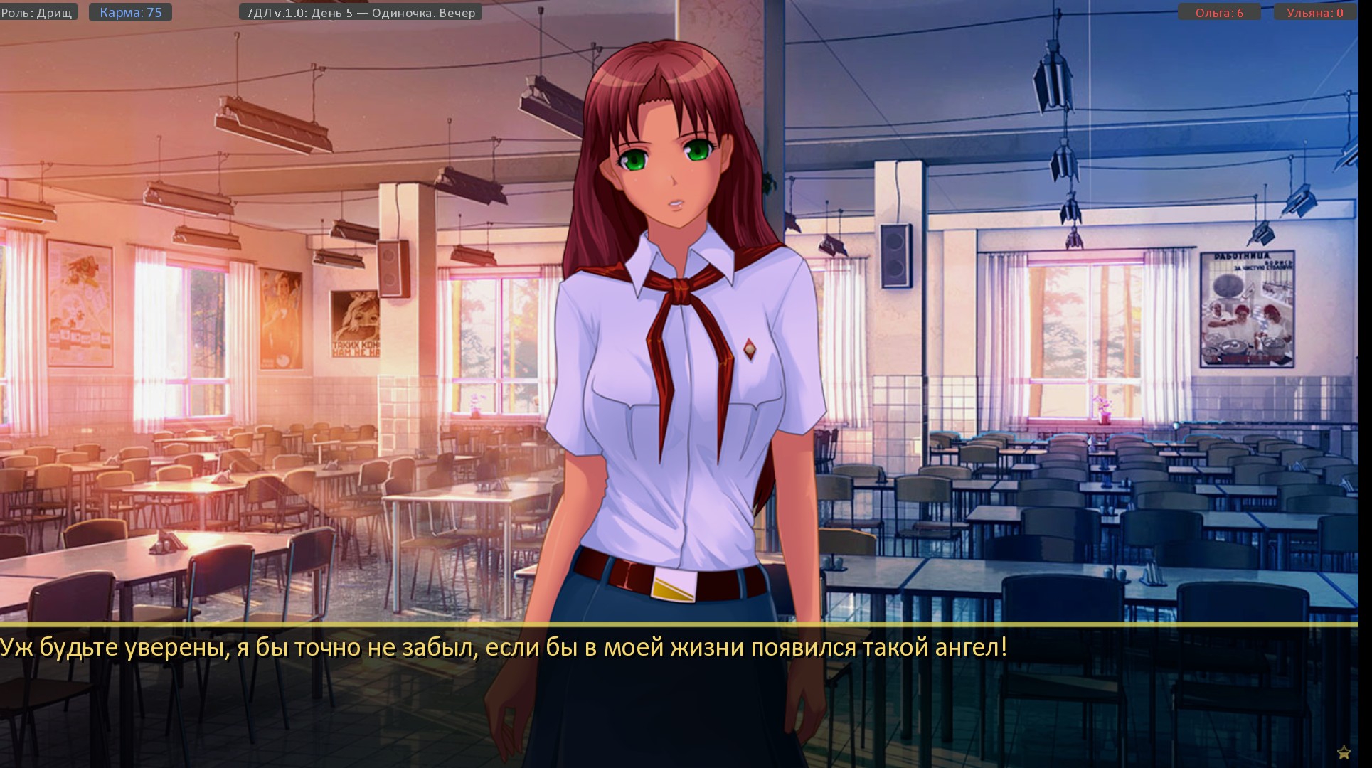 Сначала всё было как в БЛ. Я зашёл в домик Ольги когда она переодевалась. Когда она заметила и крикнула, я вышел. Но потом когда я с ней в следующий раз заговорил я ей сказал что-то вроде "Ольга Дмитриевна, у вас очень красивая жопа". За это она отправила меня дежурить на кухню с Ульяной.