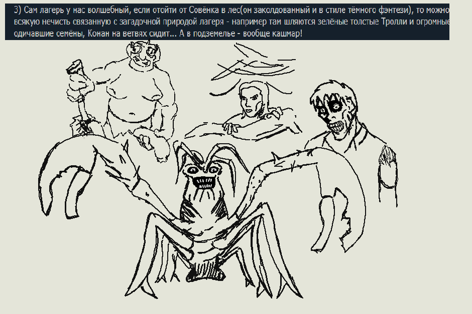 Обрисовываю картинку! Есть лагерь, по которому можно шастать и общаться с пионерками, брать-выполнять локальные квесты и квесты общие. Понятное дело, пионерок можно романсить. Чтобы не усложнять, все будет без каких-то рутов. Уделяешь внимание пионерке, выполняешь квесты - она твоя. Так можно закончить игру с разным кол-вом пионерок. За пределы лагеря можно выйти на ВыЛаЗку, чтобы пофармить мобов (заодно выполнить квест: собрать 20 яиц троллей/убить 228 НеХ/Починить генератор и тд и тп). Сама вылазка представляет из себя одну локацию, в пределах которой ты сражаешься, примерно, как в Vampire Survivors. Цели посещения локации, сложность, мобы и ее внешний вид меняются по мере выполнения квестов и продвижения сюжета в самом лагере. Ну и так пока главгада не замочим. Сюжет я намеренно опускаю.