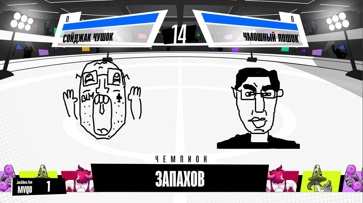 Например гладиарторы (не самый лучший пример, но все же) Раунд 1 В первом раунде игроки рисуют два типа бойцов, которые будут биться в сражениях: "чемпиона" и "аутсайдера" (противника). Рисуя "чемпиона", вы будете знать только за какой титул он будет сражаться, например, "Чемпион среди трусов". Рисуя "аутсайдера", вы будете знать только против какого персонажа он будет биться, что может помочь в создании своего бойца. Затем игроки будут голосовать за то, какой боец лучше подходит для того, чтобы стать чемпионом своих титулов. Если число голосов равняется 50/50, то по умолчанию побеждает аутсайдер.