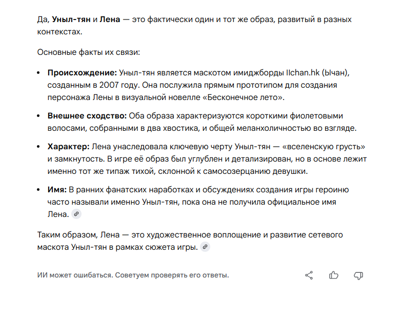 В целом, не удивлён, что её характер буквально был основан на чьей-то там бывшей и не удивлён, что именно на бывшей. Может быть это ещё одна причина "живости" характера. Такие люди реально есть, и найти ИРЛ свою Леночку это не слишком-то нетривиальная задача, особенно если ты не нормис.