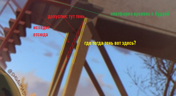 >>1254767 Тогда были бы видны контуры краев рейки, как на другом участке(пик1). Но их нет. К тому же тень какая-то очень избирательная. Падать на перекрестие падает, а на колонны не падает(пик2).
