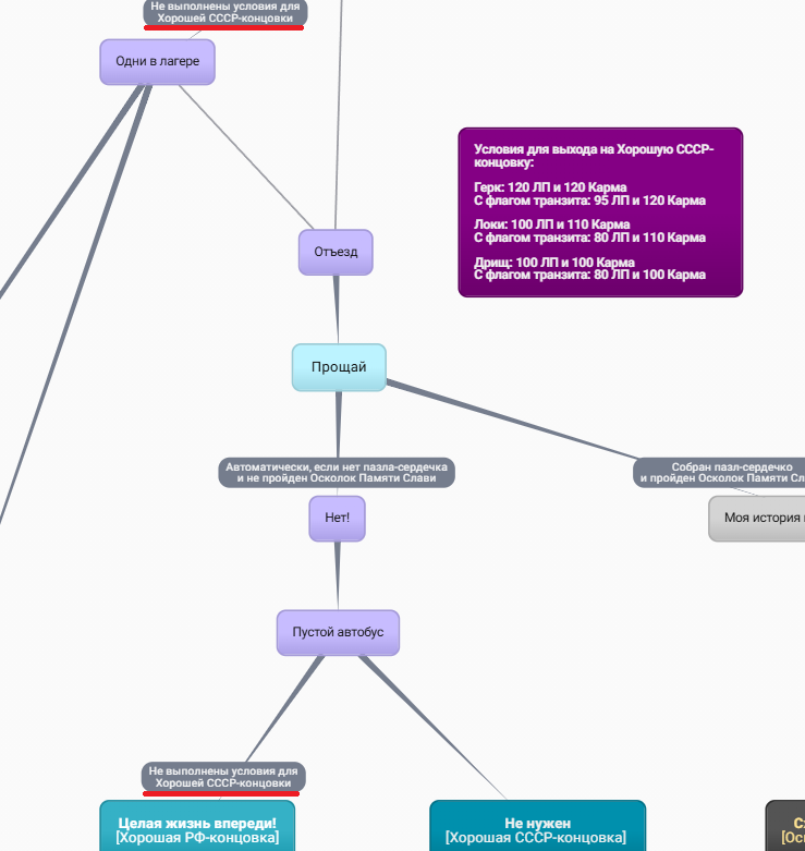 СПОЙЛЕР - НАЗВАНИЯ КОНЦОВОК Лены 7ДЛ. Аноны, подскажите, как получить хорошую РФ концовку Лены? По логике схемы выйти на неё будто невозможно, потому что не набрав нужно количество ЛП и кармы для хорошей СССР концовки, нельзя пойти по пути "Отъёзд".