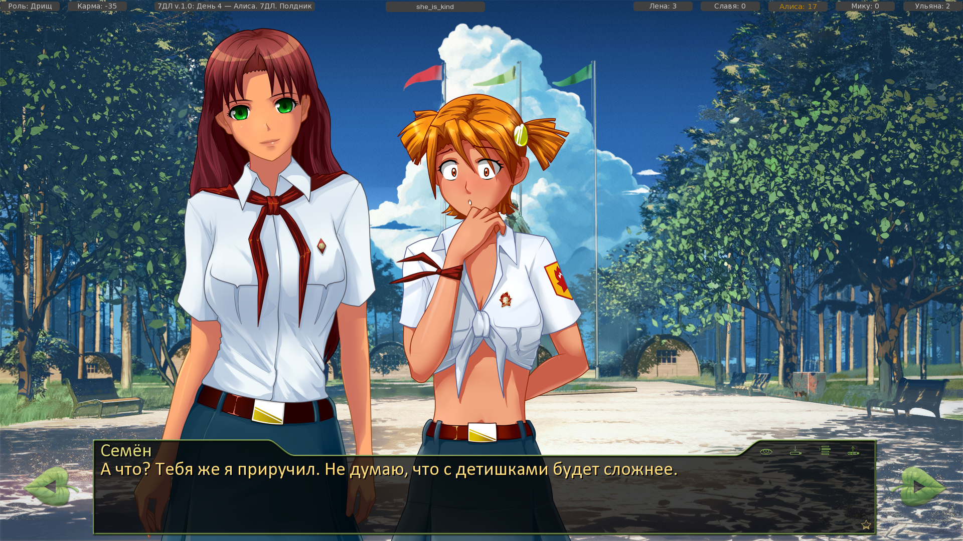 Эй, Амбалы, почему тут нет выбора полапать Лену? Можно сделать после этого катапульту с линчеванием Семёна всеми пионерами прям в столовой! Такая то октябрёнокская феминистическая мораль будет, все додевяточники точно будут знать, что пионерок лапать нельзя!