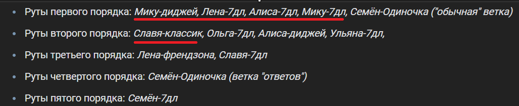 >>1258196 Таймлайн концовки Моя Мику: 1. ГЛД: после 7 дней в Совёнке Нулевого попадает в 1 из рф-фантазмов, после чего совершает суицид, прыгнув с моста. 2. Мику: приезжает в Калинин с уже Мажором. 3. Семён-2: выходит на Старую Дорогу в возрасте 6 лет и приезжает в мир Нулевого конца 1990 года. 4. Мику: встречает Семёна-2 в Ленинграде Нулевого в конце 1990 года и отводит его в ЦСР. В дальнейшем навещает его и общается вплоть до мая 1991 года. 24 мая 1991 года погибает на глазах у Семёна-2. 5. ГЛД: после суицида подселяется в 34летнего Семёна-2 в конце 2018 года. Едет в Саппоро на могилу Мику. 6. Концовка: вероятно в случае ММ далее происходит катапульта от эмоционального перенапряжения и Юля после повторной смерти ГЛД подселяет его в Нулевое, в начало смены. 7. Память Мику: в момент знакомства Юля подселяет к лагерной Мику память умершей в 1991 году Мику. Поэтому та узнаёт ГЛД.