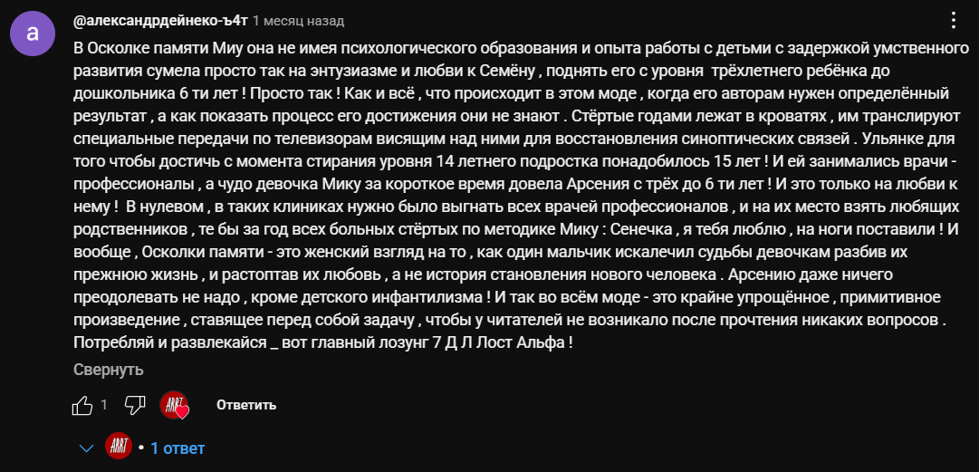 >>1255552 Ты просто долго в пиве варишься и не замечаешь насколько со стороны странно смотрятся даже некоторые концепты внутри ЛА. Единственная пивошиза, которая органично вписывается в сеттинг летанька это ПСРщина(как вариант объяснения почему можно попасть из зимы РФ-20XX в лето СССР-198X), ну и ГЛД как проявление мультиверса. Старая Дорога и Пoрридж это уже на самом деле чисто васянские концепты пивия, которые он позаимствовал из потребляемого им фикшна. И если старую Дорогу худо бедно удалось привязать к глобальному сторилайну(хоть и косвенно). То октябрёнок в пиве это самая слабая чужеродная и ебанутая часть лора, которая: -по большей части нахуй не нужна, единственное место где оно имеет значительную роль это арка Ульяны(т.к её драма завяана на стёртых) -является шизонадстройкой над летоньковым мультиверсом. Положняк на тему того, что разные миры и так возникают сами по себе из-за разных решений сохранился, просто теперь в итоге над ним запихнули её октябрёнок, сделав мультиверс в мультиверсе. Хотя ценность околонулевая, разве что создать драму на разок(сливя-кл) или послужить очередной заплаткой(мажор) -превращает сеттинг в цирк шапито ещё больше. октябрёнок по сути предвестник септимного говна с всесильными божками, вертящими вселенную пива на хуе. Неодушевленная йоба, которая меняет реальность, зазцвает жертв, из-за которой в детском сука лагере вынуждены держать агентов КГБ, ну если трезво посмотреть ну гавной воняет.