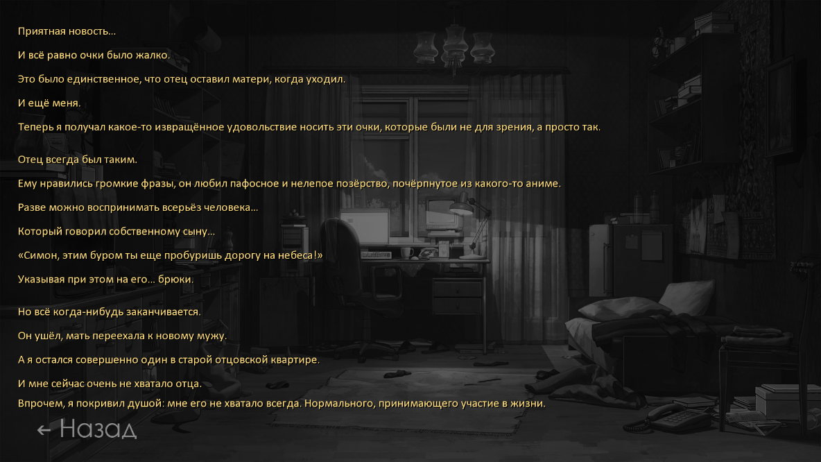 Кстати концовка альфы намекает что будут прыжки по рутам из дня в день. В идеале тут бы адаптировать механику повторяющихся циклов с ветвящимся флоучартом с механикой накопления информации из разных моментов истории чтобы разблокировать новые выборы в других ветках развития как в серии Zero Escape, но для ритана такое сложно будет.