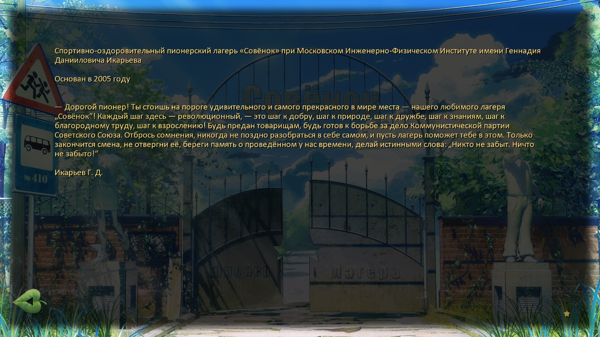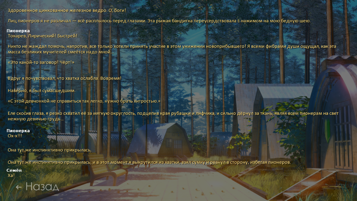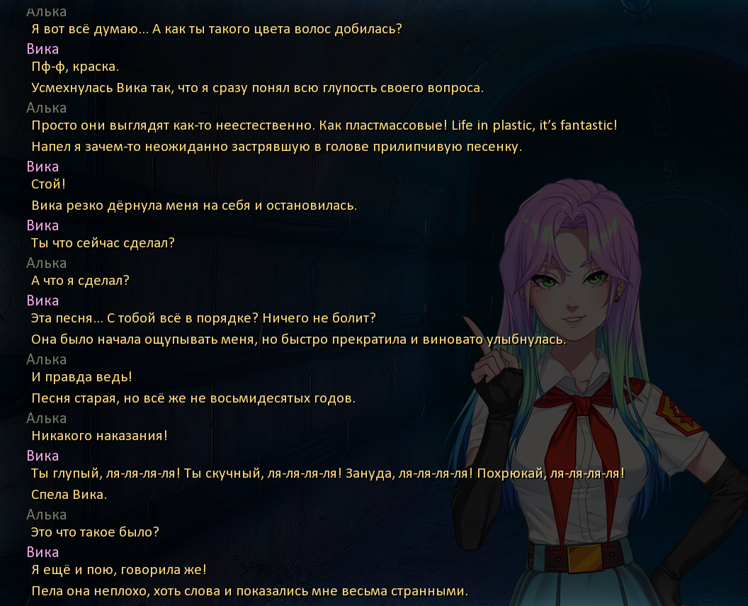 >>1267787 Еще Бункер поменялся, теперь это огромное сооружение, причем все в ахуе, потому что помнят старую комнатушку. В Бункере не работает наказание за разговоры о настоящем мире. Уйти из лагеря нельзя - вырубишься и наутро проснешься в кроватке. Все кроме ГГ, Славы и главных тяночек - НПС. НПС верят что они пионеры. У НПС стоит блок на разговоры о бункере. Иногда НПС могут сломаться.