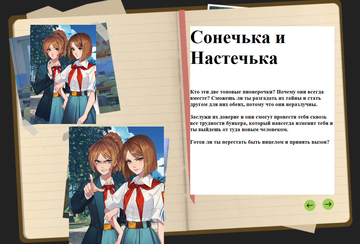 >>1267411 Так а нах спойлерить? Тем более Ритан же не возьмёт мой сюжет, я хочу чтоб он свой выдумал. Да и писал я уже много. Придумать классный бэкграунд не проблема, было бы желание. А концепт это как раз то что их двое и они всегда вместе. Можно даже один спрайт на двоих сделать. Ну единый типа. Сам подумай, ты где нибудь видел спрайт где две пионерки взаимодействуют (взялись под руки)? Я не припомню. Их можно сделать секретным рутом по типу Юли (ну только без магии). И сыграть на том что они ноунеймы с нормальным цветом волос, но они необычные пионерки. Что-то такое. Что скажешь? Я кстати думал уже написать фанфик. Таланта нет но есть идея и желание. Вдруг кто опытный потом отредачит)))