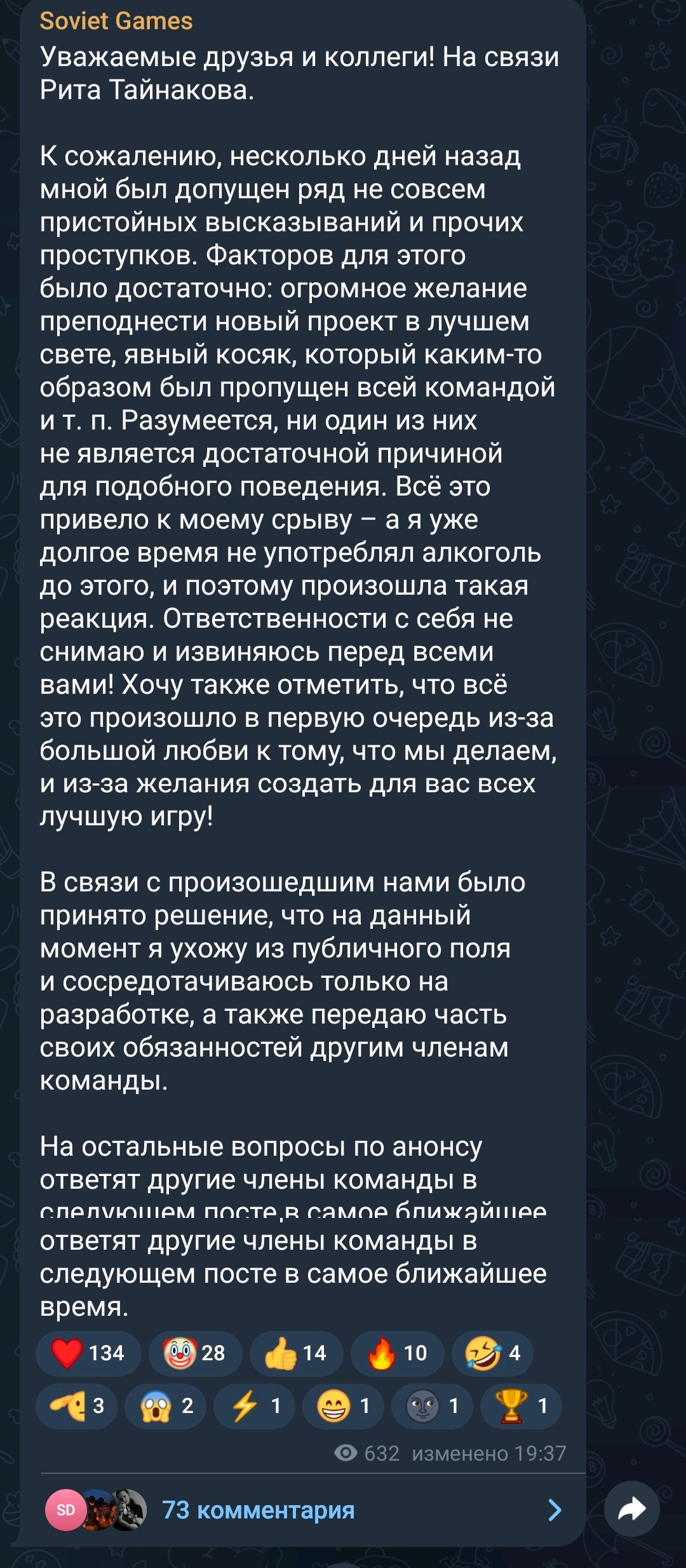 К сожалению, несколько дней назад мной был допущен ряд не совсем пристойных высказываний и прочих проступков. Факторов для этого было достаточно: огромное желание преподнести новый проект в лучшем свете, явный косяк, который каким-то образом был пропущен всей командой и т. п. Разумеется, ни один из них не является достаточной причиной для подобного поведения. Всё это привело к моему срыву – а я уже долгое время не употреблял алкоголь до этого, и поэтому произошла такая реакция. Ответственности с себя не снимаю и извиняюсь перед всеми вами! Хочу также отметить, что всё это произошло в первую очередь из-за большой любви к тому, что мы делаем, и из-за желания создать для вас всех лучшую игру!