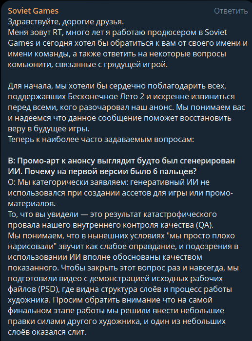 В: Промо-арт к анонсу выглядит будто был сгенерирован ИИ. Почему на первой версии было 6 пальцев? О: Мы категорически заявляем: генеративный ИИ не использовался при создании ассетов для игры или промо-материалов. То, что вы увидели — это результат катастрофического провала нашего внутреннего контроля качества (QA). Мы понимаем, что в нынешних условиях "мы просто плохо нарисовали" звучит как слабое оправдание, и подозрения в использовании ИИ вполне обоснованы качеством показанного. Чтобы закрыть этот вопрос раз и навсегда, мы подготовили видео с демонстрацией исходных рабочих файлов (PSD), где видна структура слоёв и процесс работы художника. Просим обратить внимание что на самой финальном этапе работы мы решили внести небольшие правки силами другого художника, и один из небольших слоёв оказался слит.