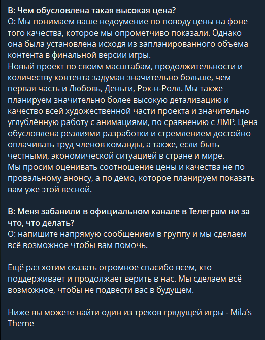 В: Чем обусловлена такая высокая цена? О: Мы понимаем ваше недоумение по поводу цены на фоне того качества, которое мы опрометчиво показали. Однако она была установлена исходя из запланированного объема контента в финальной версии игры. Новый проект по своим масштабам, продолжительности и количеству контента задуман значительно больше, чем первая часть и Любовь, Деньги, Рок-н-Ролл. Мы также планируем значительно более высокую детализацию и качество всей художественной части проекта и значительно углублённую работу с анимациями, по сравнению с ЛМР. Цена обусловлена реалиями разработки и стремлением достойно оплачивать труд членов команды, а также, если быть честными, экономической ситуацией в стране и мире. Мы просим оценивать соотношение цены и качества не по провальному анонсу, а по демо, которое планируем показать вам уже этой весной.