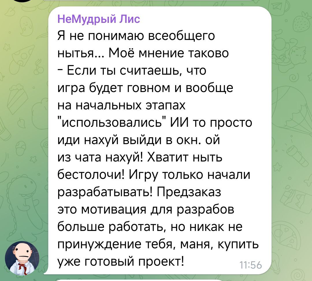 Moonworks при всё уважении нищие ребята, которые уже прон в ТГ простят ради подписоты Если сейчас они резко не найдут ресурсы на доработку и выпуск, есть все шансы им разойтись навсегда
