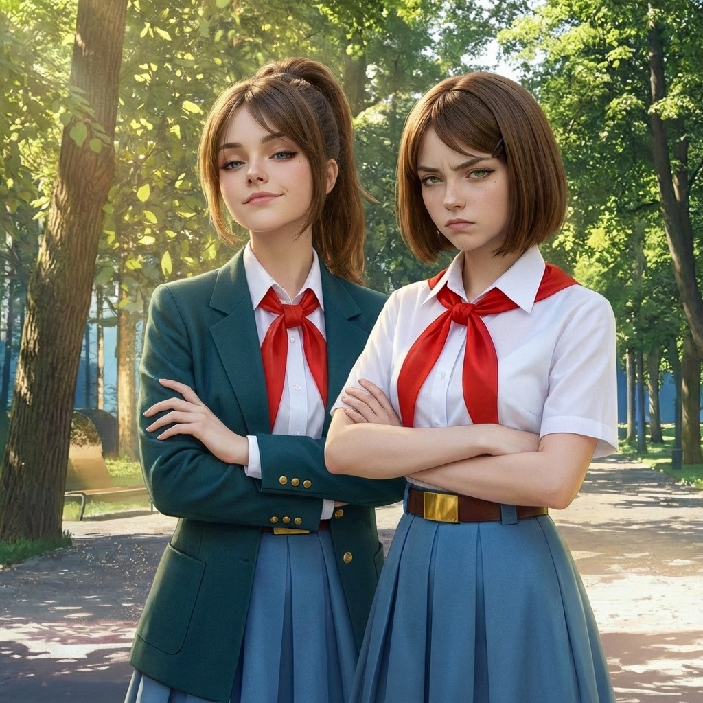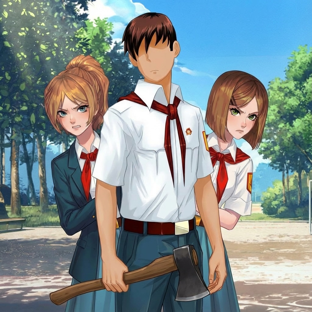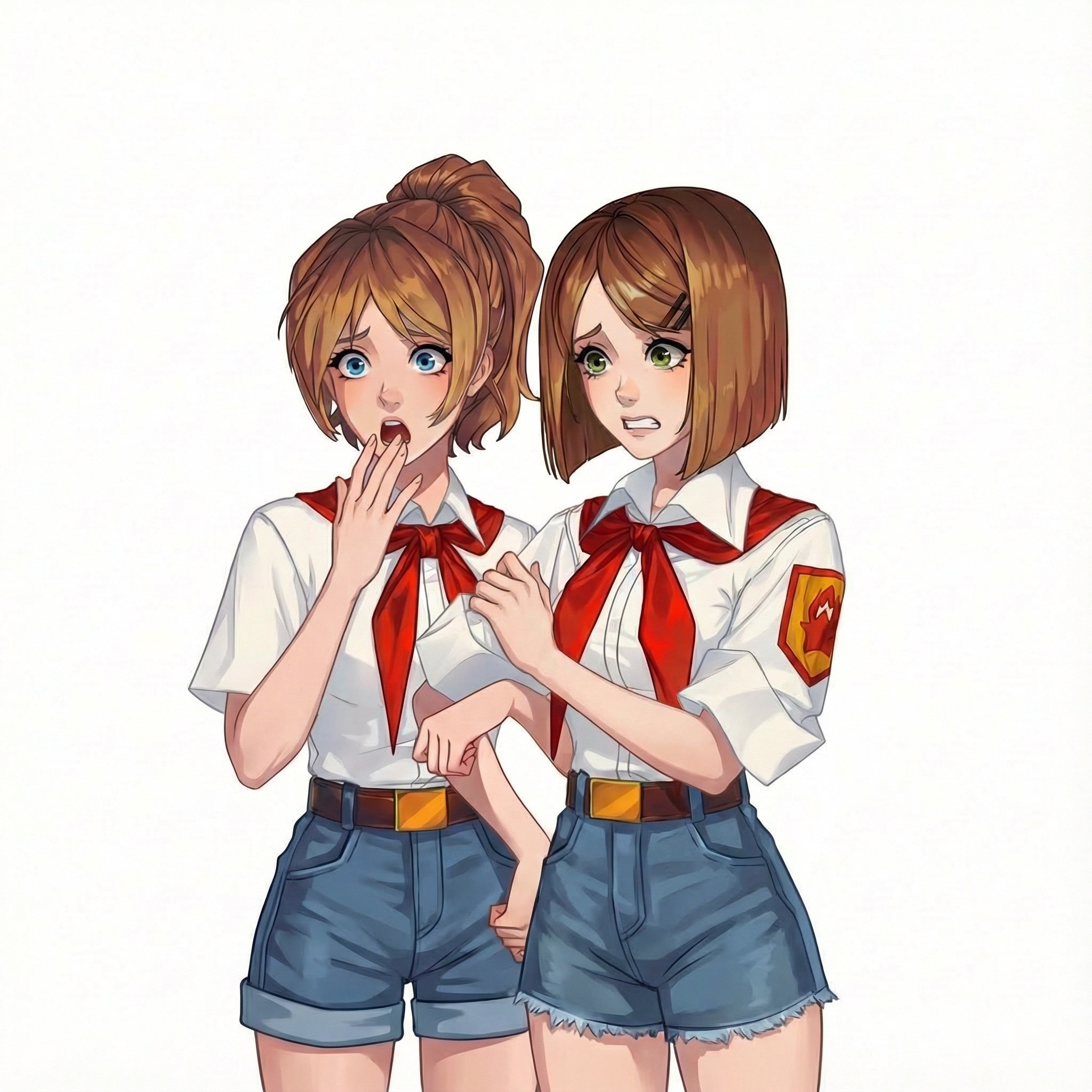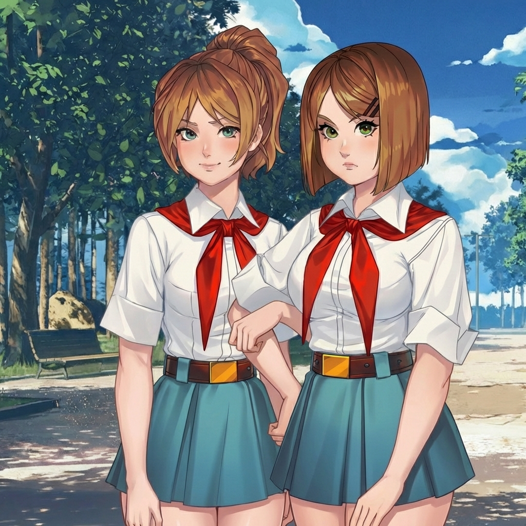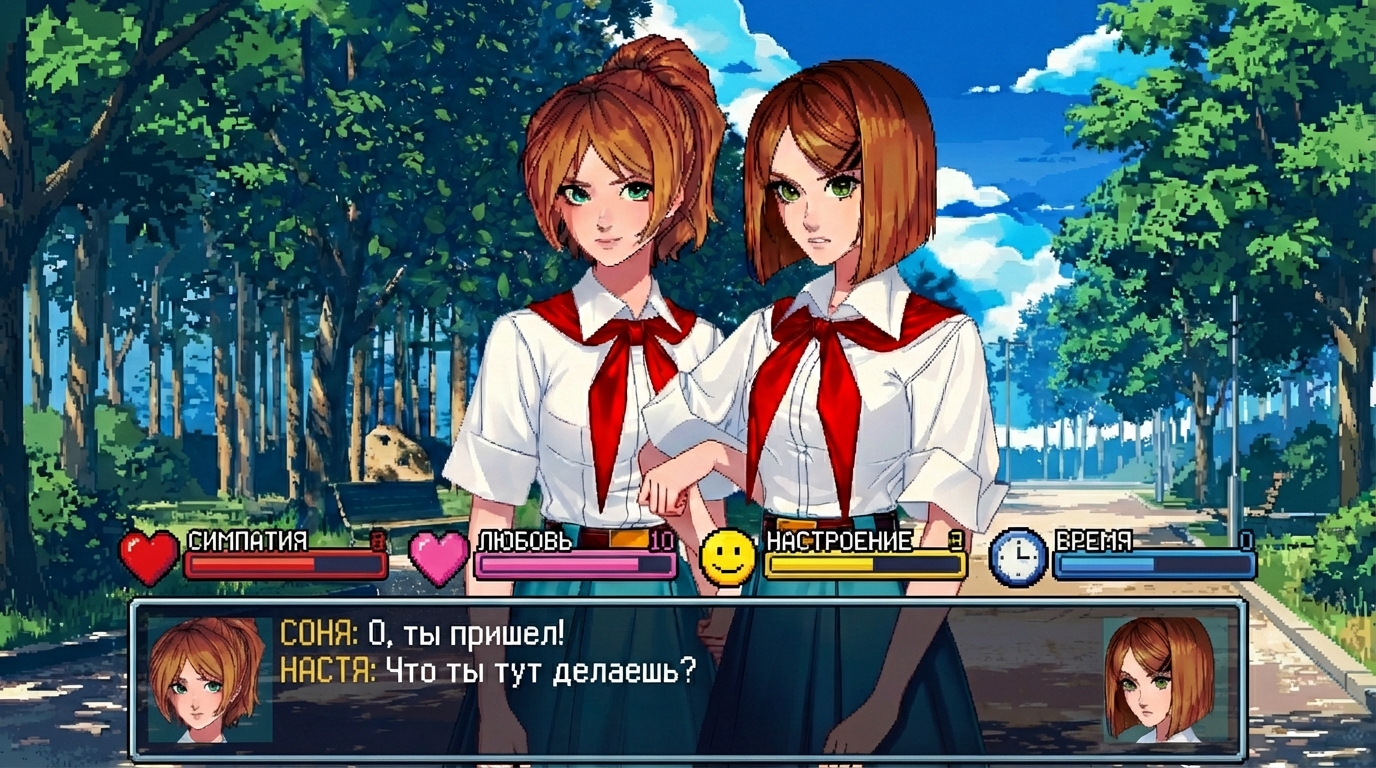Это Соня и Настя, самые оригинальные пионерки Бесконечного Лета 2. Почему? Да потому что, на самом деле, это одна пионерка, которая при попадании в лагерь разделилась на две личности. (ну или еще есть версия, что это одна личность из двух параллельных вселенных, не суть).