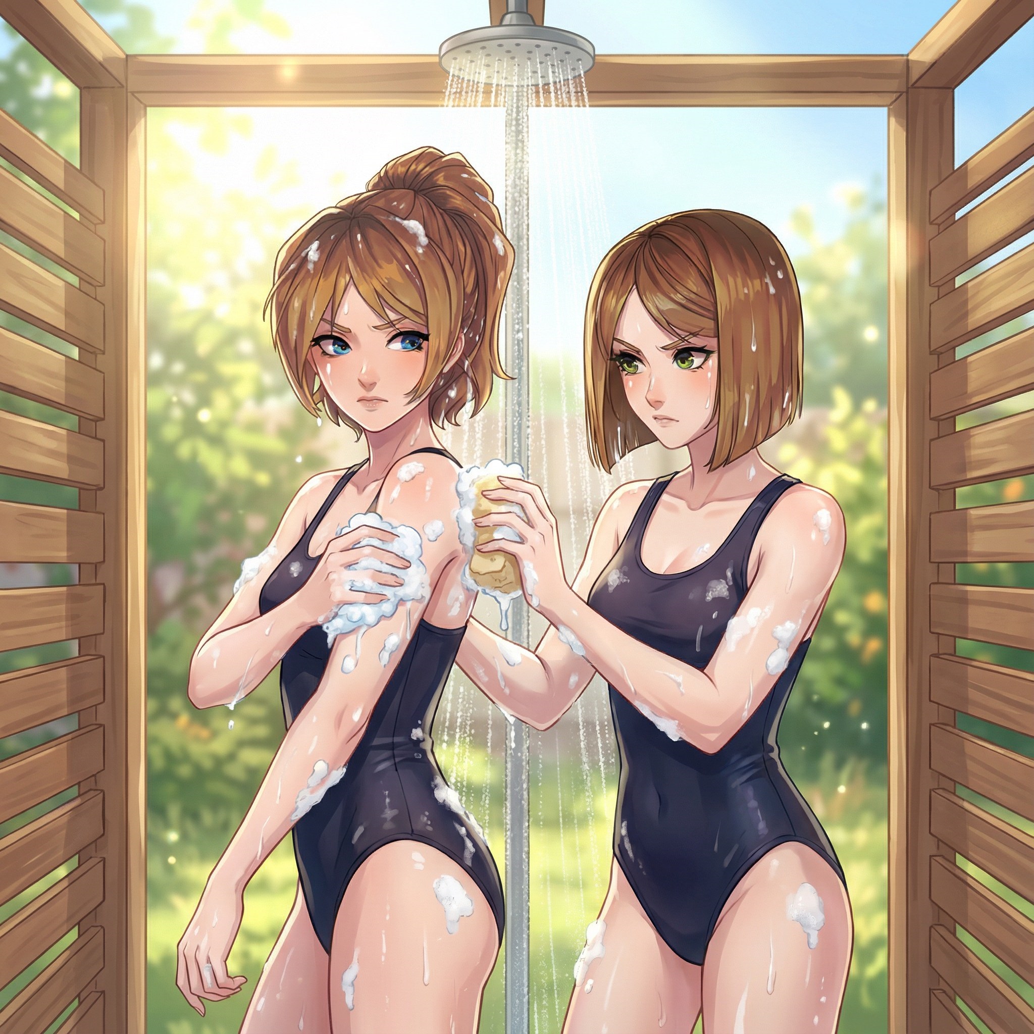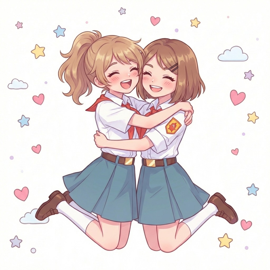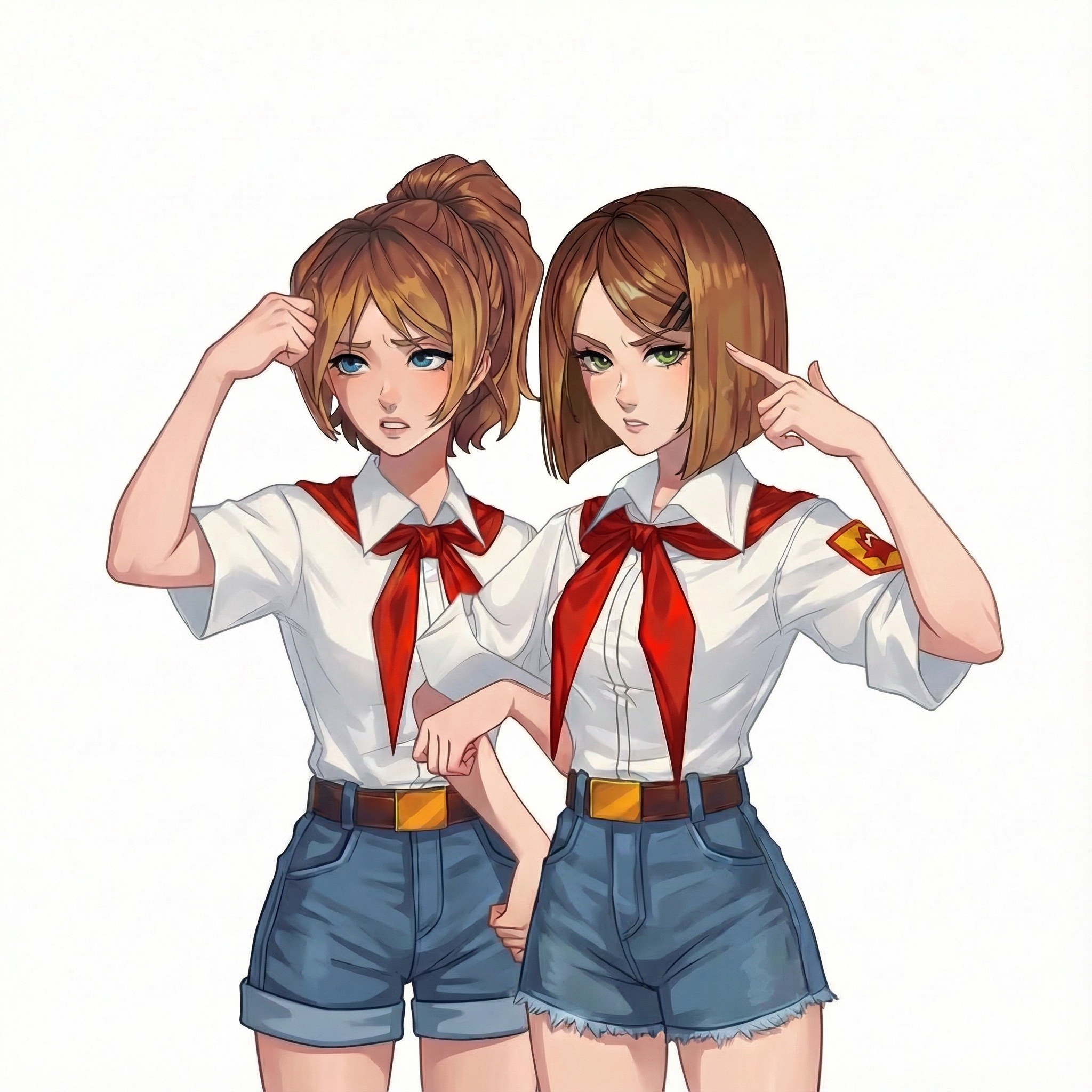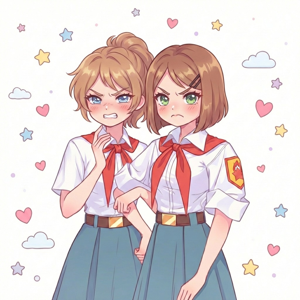 Это Соня и Настя, самые оригинальные пионерки Бесконечного Лета 2. Почему? Да потому что, на самом деле, это одна пионерка, которая при попадании в лагерь разделилась на две личности. (ну или еще есть версия, что это одна личность из двух параллельных вселенных, не суть).