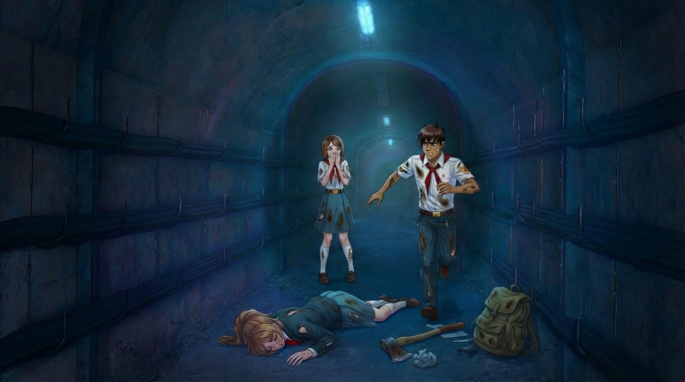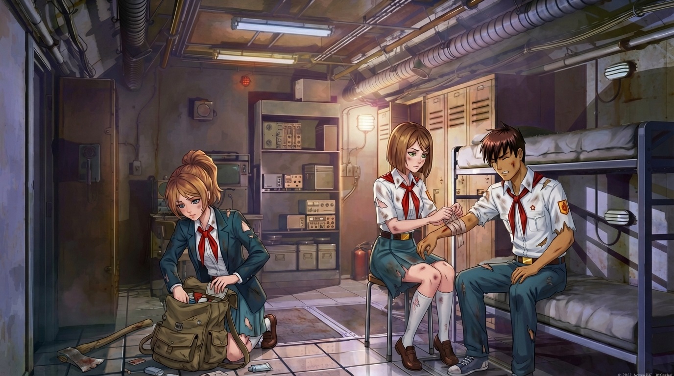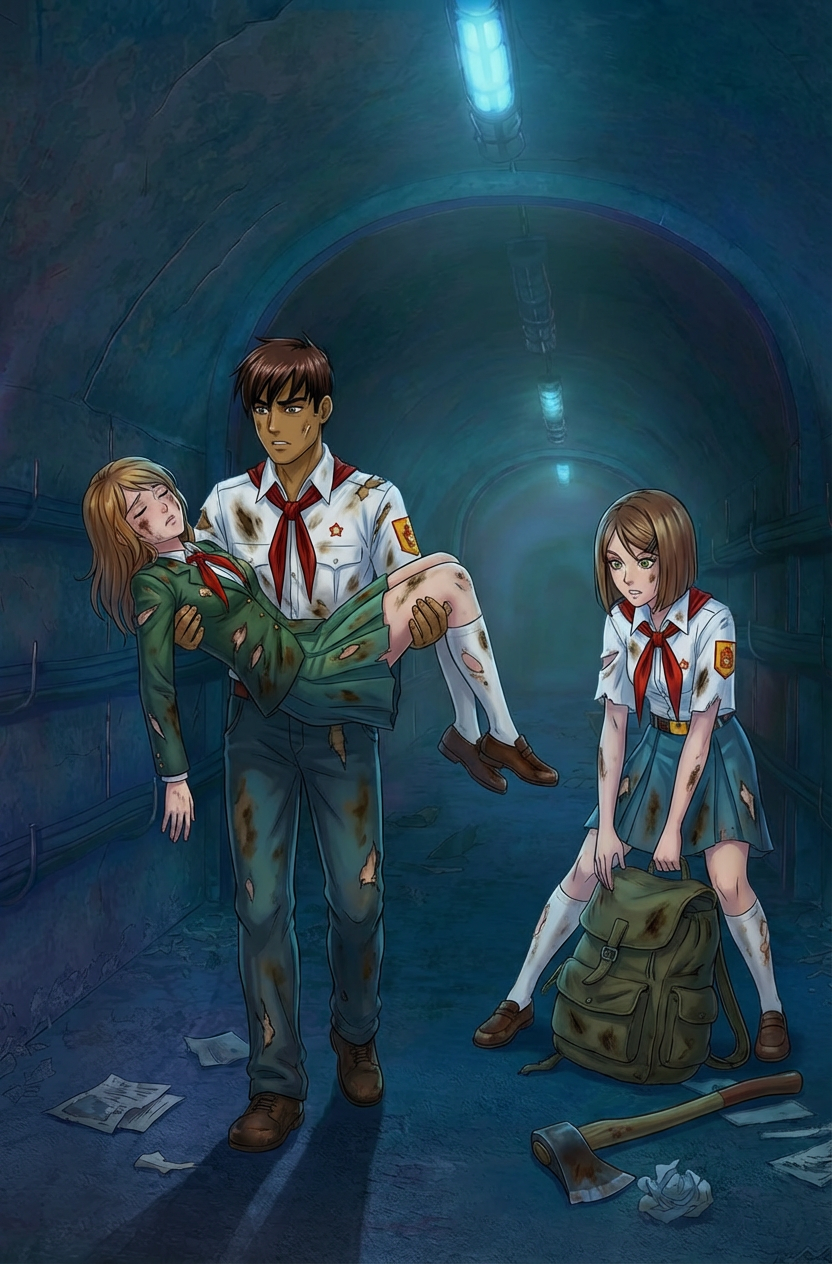 Один из вариантов сцены: Они в каткомбах около входа в бункер сделали минибазу, и долгое время пытаются открыть дверь. Хорошая сцена для того чтобы показать отчаяние пионеров, то как они с ним борются, поддерживают друг друга, ведь пути назад то нет. Ну и через какое-то время Semen открывает дверь, а сам каким-то образом откидывается на пол дня. Типа ударился + усталость + еду отдавал девочкам. Девочки его затащат внутрь и будут ухаживать и заботится за ним, проникаясь чувствами к нему, за что он для них делал всё это время. Нужна прям какая-то жертва ради них. Чтото что Semen сделал такого рискового. Ну опять там волки может за ними в катакомбы свалились или еще какой дикий зверь (если не монстр). +1 момент для закрепления чувств между Семенем и девочками (ну которая по сути одна девочка как мы помним).