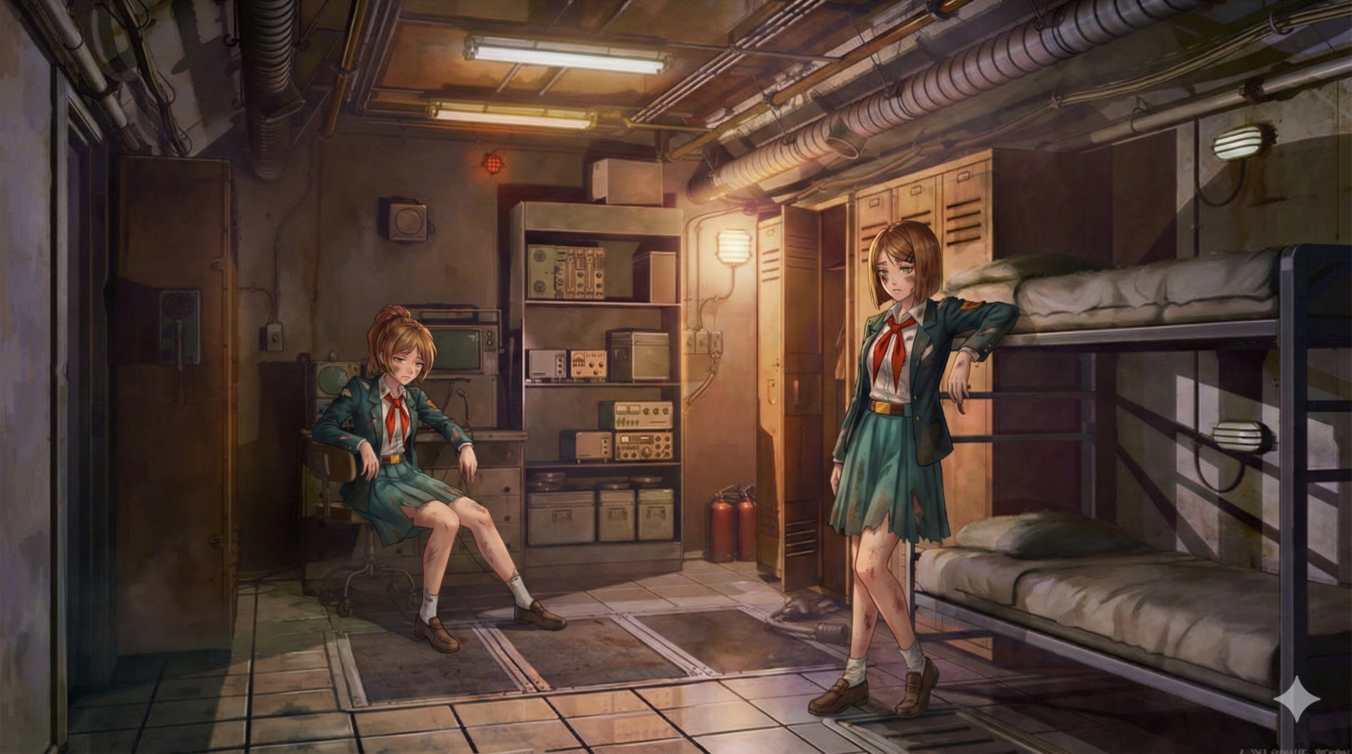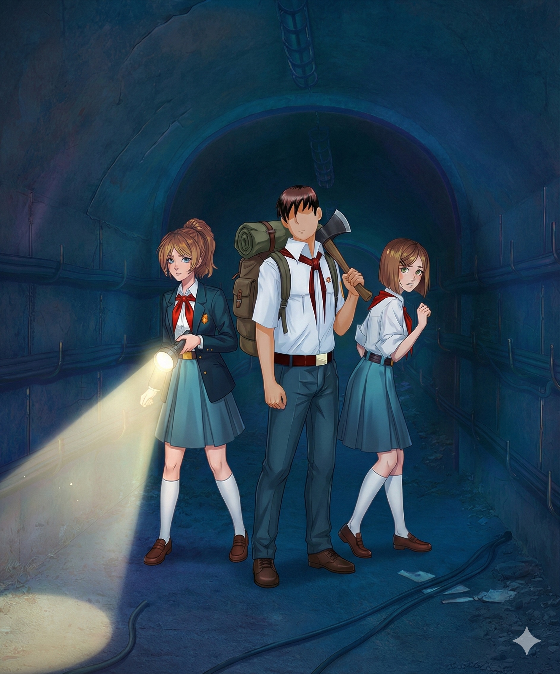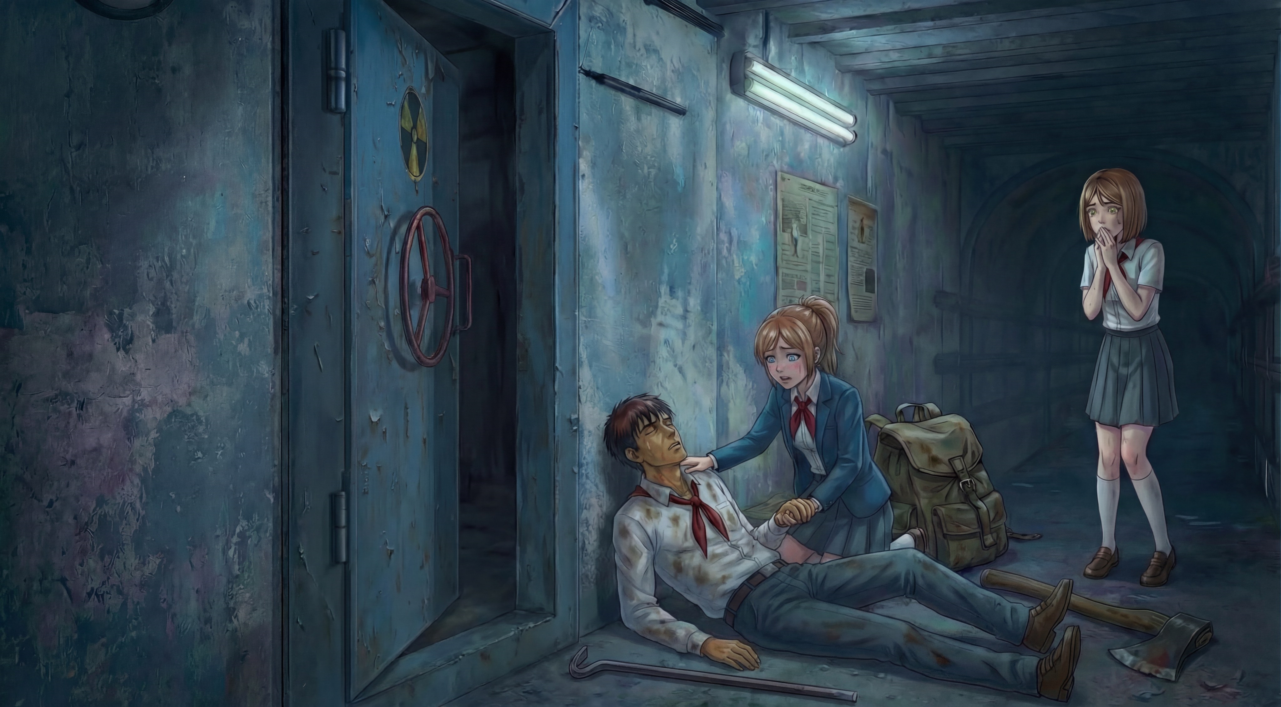 Один из вариантов сцены: Они в каткомбах около входа в бункер сделали минибазу, и долгое время пытаются открыть дверь. Хорошая сцена для того чтобы показать отчаяние пионеров, то как они с ним борются, поддерживают друг друга, ведь пути назад то нет. Ну и через какое-то время Semen открывает дверь, а сам каким-то образом откидывается на пол дня. Типа ударился + усталость + еду отдавал девочкам. Девочки его затащат внутрь и будут ухаживать и заботится за ним, проникаясь чувствами к нему, за что он для них делал всё это время. Нужна прям какая-то жертва ради них. Чтото что Semen сделал такого рискового. Ну опять там волки может за ними в катакомбы свалились или еще какой дикий зверь (если не монстр). +1 момент для закрепления чувств между Семенем и девочками (ну которая по сути одна девочка как мы помним).