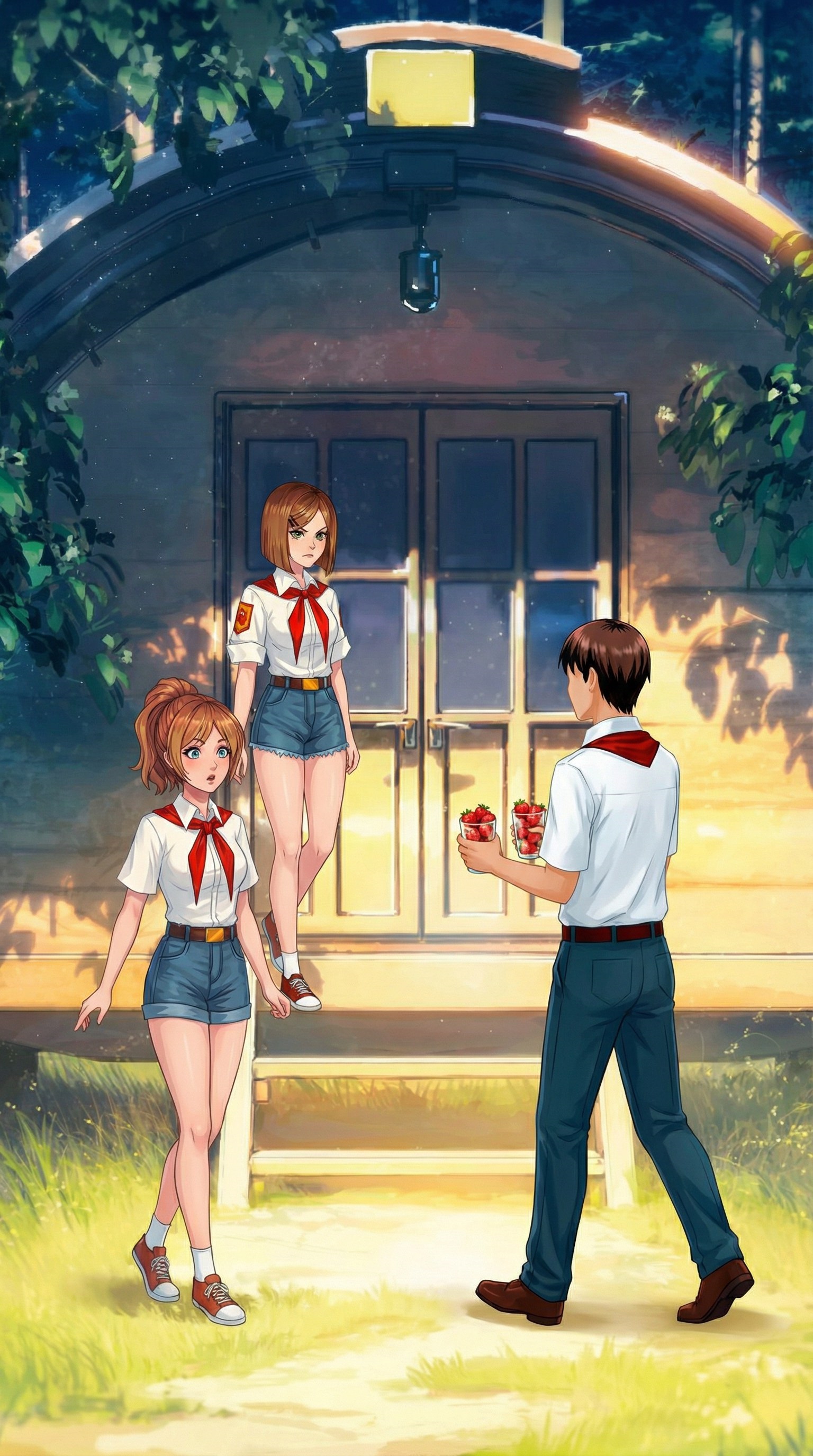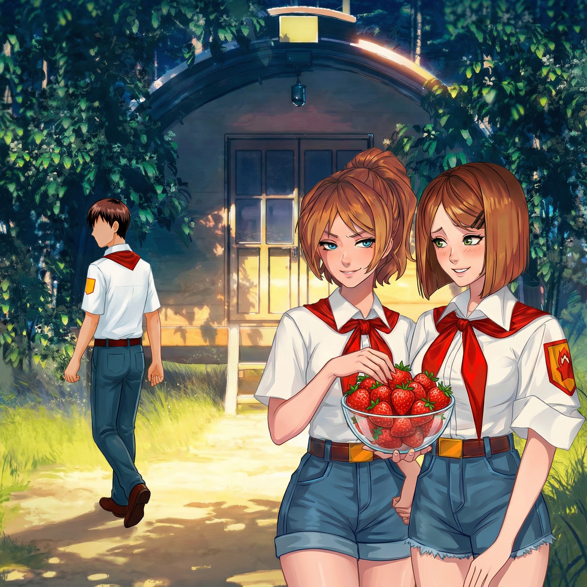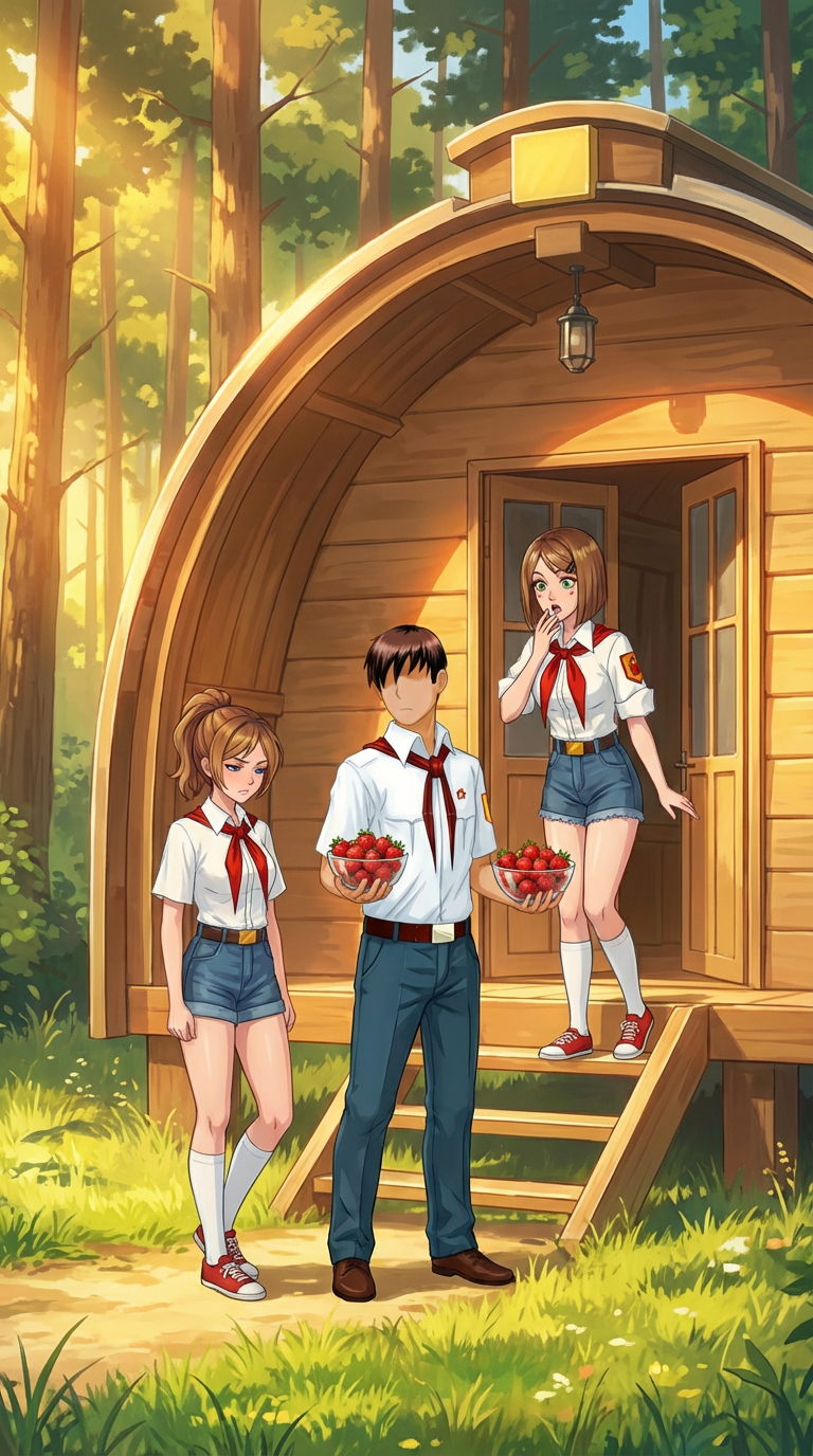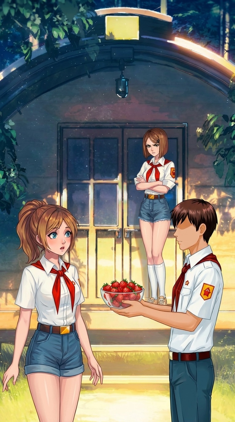 Один из вариантов сцены: Семён просыпается в 4 утра, чтобы пойти на остров и набрать земляники, пока её не растащили другие пионеры. Это единственный варик её достать. Приносить девочкам много ягод, как и обещал. Либо должен за что-то. Об ухаживаниях скорее всего речи нет, т.к. он один их двое, октябрёноковская мораль всё такое. Поэтому просто Семён показывает что держит слово, что может и что хочет. По закону жанра девочка должна сопротивляться, поэтому они типа морозятся. Но не так как вниманиебляди или торгующие вареником "настоящие женщины" а как девочки. по доброму. Тут будут милые диалоги, и анимешное цундерное смущение а-ля "самый лучший спрайт Алисы".