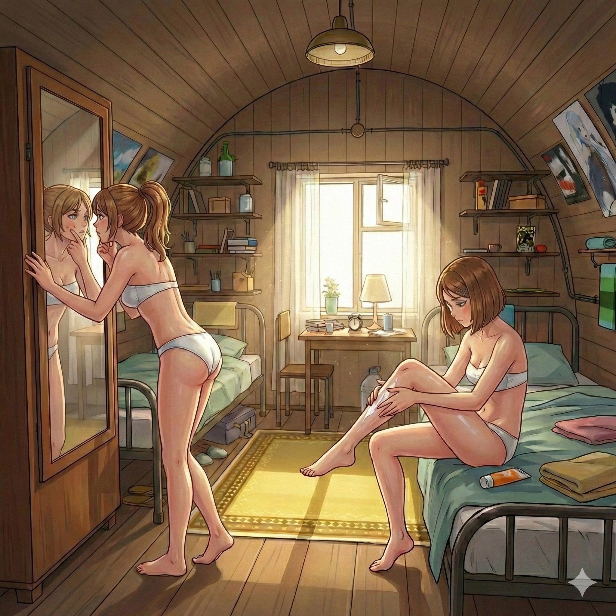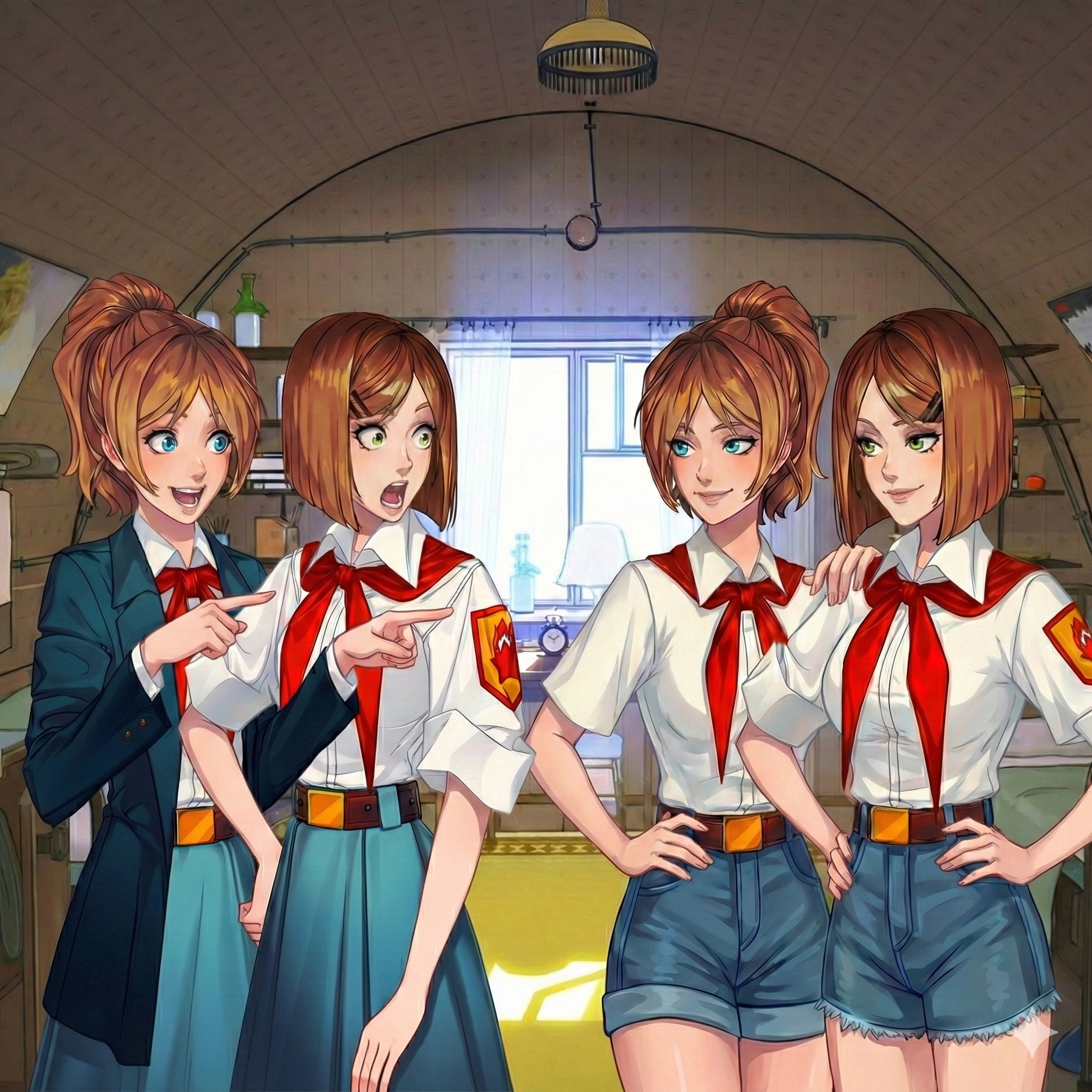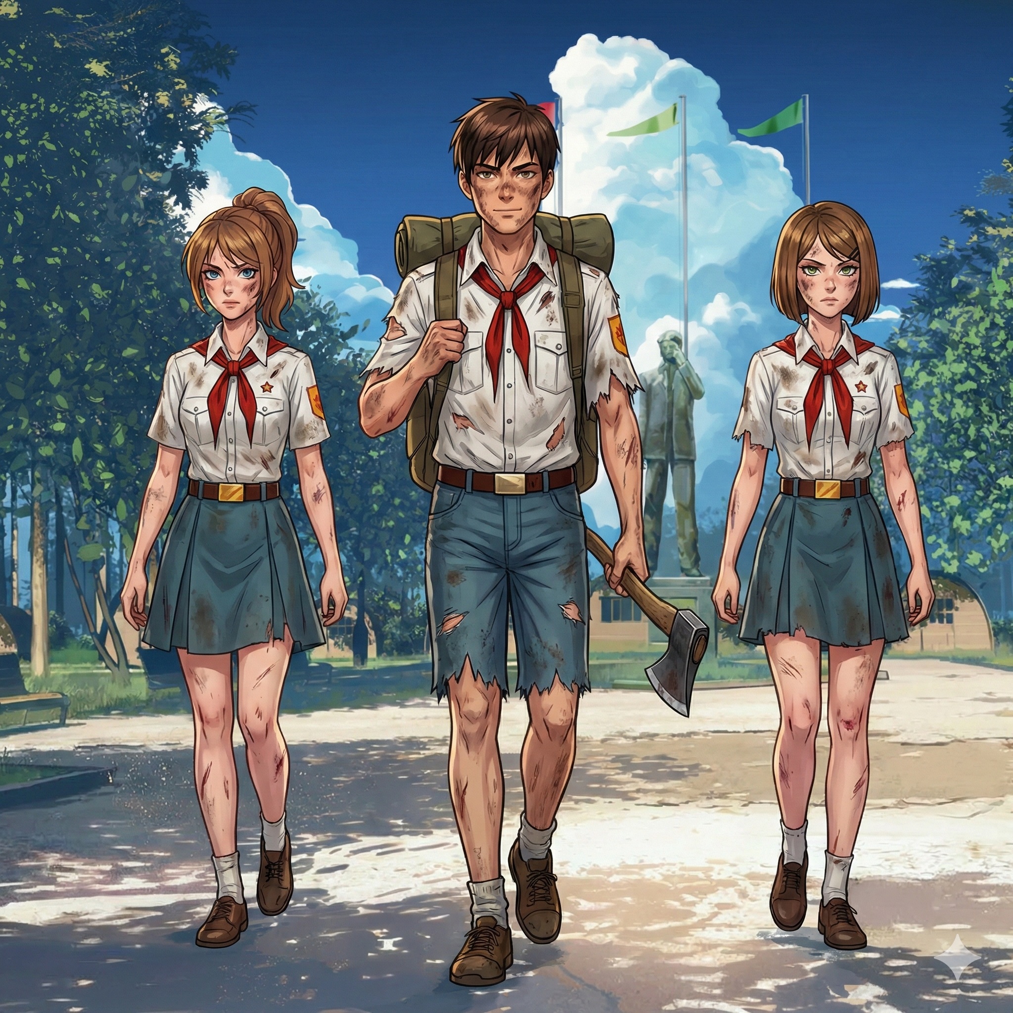 Во время похода происходит трансформация характеров. И то, что они изменились надо закрепить сменой внешнего вида. Кажется интересный ход будет. Не припоминаю такого в модах. Пиджак, использованный в бункере на что-то, уходит, а изодранные длинные юбки сменяются на короткие шорты (ну если это допускается лагерем, судя по Алисе/Ане, которая ходит в шортах то так можно будет). Будет такое небольшое подкрепление их изменению и "превращению" в более полноценные личности. Ну это если Семён не проебётся с выборами и не обосрёт всю малину.