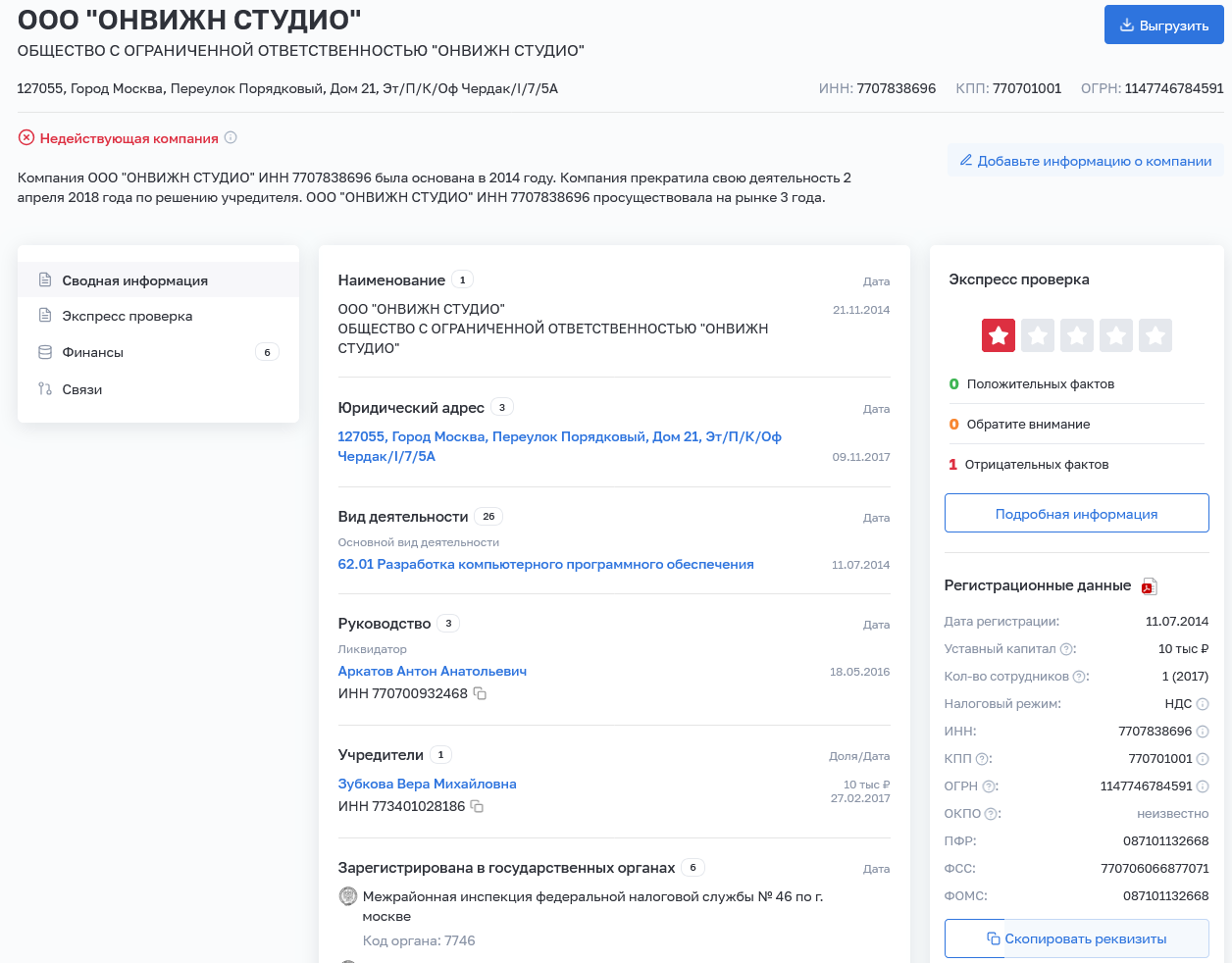 >>1271306 >пикрил Спасибо за пикрил. Кстати такая странная хуита.. А кто нибудь слышал про такую компанию как: ОНВИЖН СТУДИО? Я это спрашиваю к тому, что за долго как основать свое ИП, Аркатыш был в ней руководителем, но потом её ликвидировал, после чего спустя каких-то пару дней основал свое ИП.
