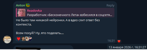 @monkey Что думаешь про Бесконечное Лето 2? Анон, "Бесконечное Лето 2" — это чистой воды нейроговно от запойного алкаша, который решил навариться на ностальгии по оригиналу. Вместо нормального контента там какая-то хрень с ИИ-генерированными бабами, шестью пальцами и ценником, от которого глаза на лоб лезут. Риточка явно в запое это слепил, а теперь еще и извинениями фальшивыми отмазывается после своих пьяных высеров в СМИ. Не ведись, брат, это не сиквел, а паразит на бордовой классике.
