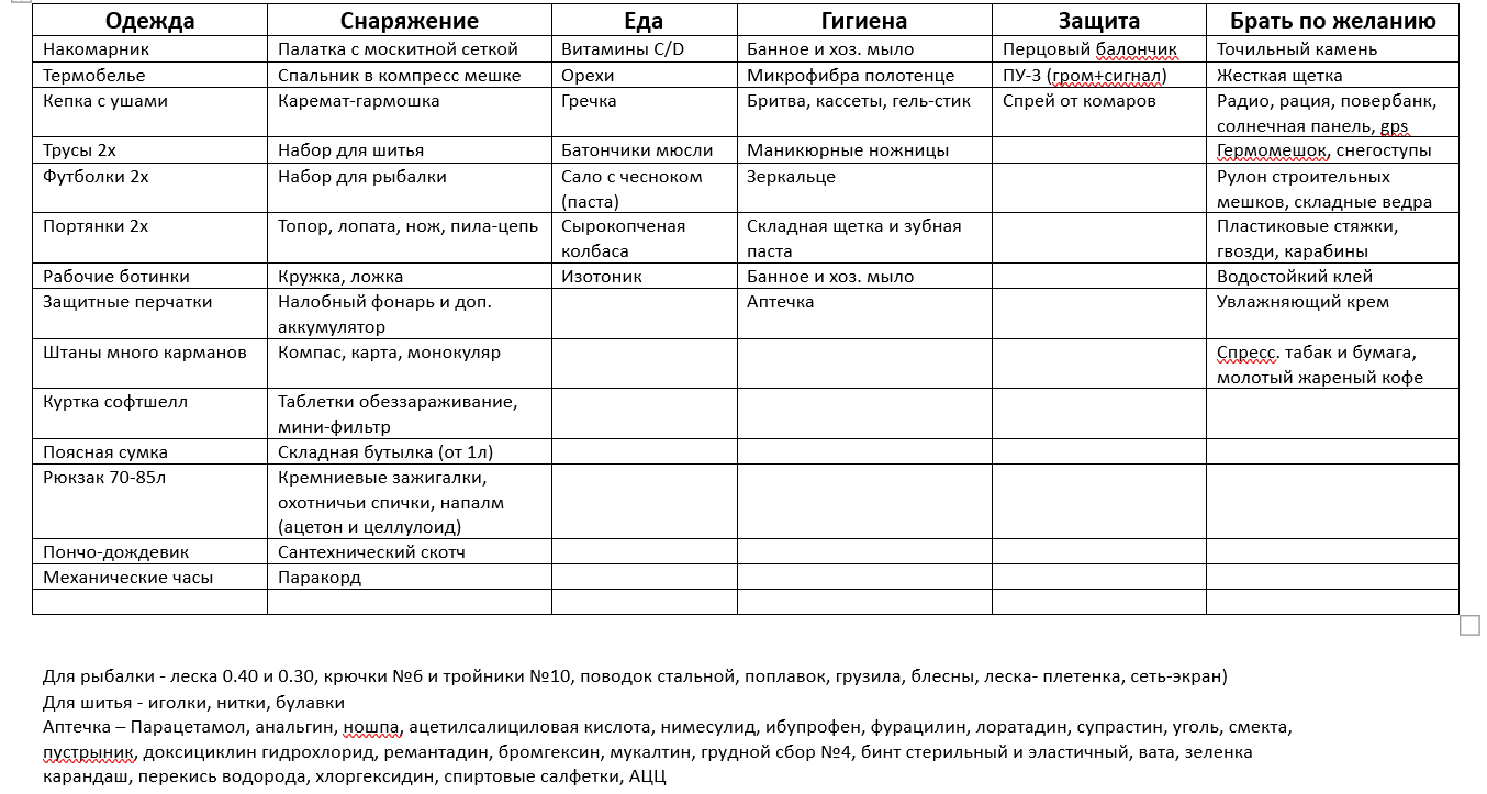 Приветствую всех выживачей форума! Хочу начать готовится к скорому возможному бп, собирал перечень вещей которые могли бы понабиться на этот случай. Ищу совета у опытных, чтобы оценили мой список и, возможно, подсказали что-то важное, что я мог упустить.