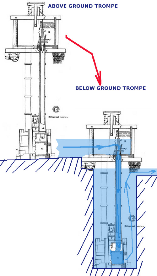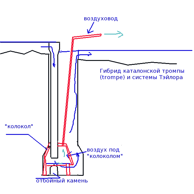 >>147658 >даже этот воздух в лачугу подавать прямо в печь. Так тромпу в Испании для этого и изобрели - подавать воздух в кузнечный горн. Но в тромпе воду в верхнюю бадью носили в ведрах, а я предлагаю поместить эту тромпу в колодец и вода самотеком будет в не затекать.