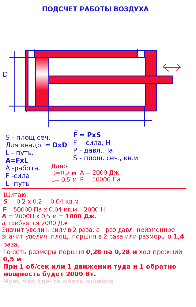 Выясняем объем: Об = Эн./Дав. = 2000Дж/50000Па = 0,04 куб. м или 40 литров. Таков объем цилиндра(или полого куба) этого пневматического двигателя, если он будет совершать одно движение в секунду.