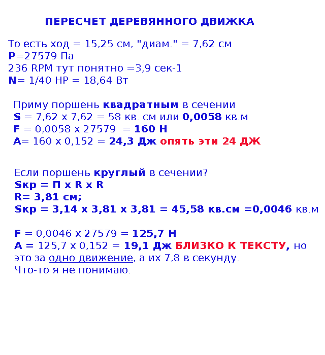 Значит объем 7,62х7,62х15,25 = 885 куб.см. или 0,89 л или 0,0009 куб. м. Давление >>146953 >27579 Па И работа за один цикл примерно 0,0009х27576 = 24 Дж. Что-то я прогнался где-то 236 об/м = 3,9 об/сек и мощность будет 24х3,9=94 Вт, а у него 18,64.