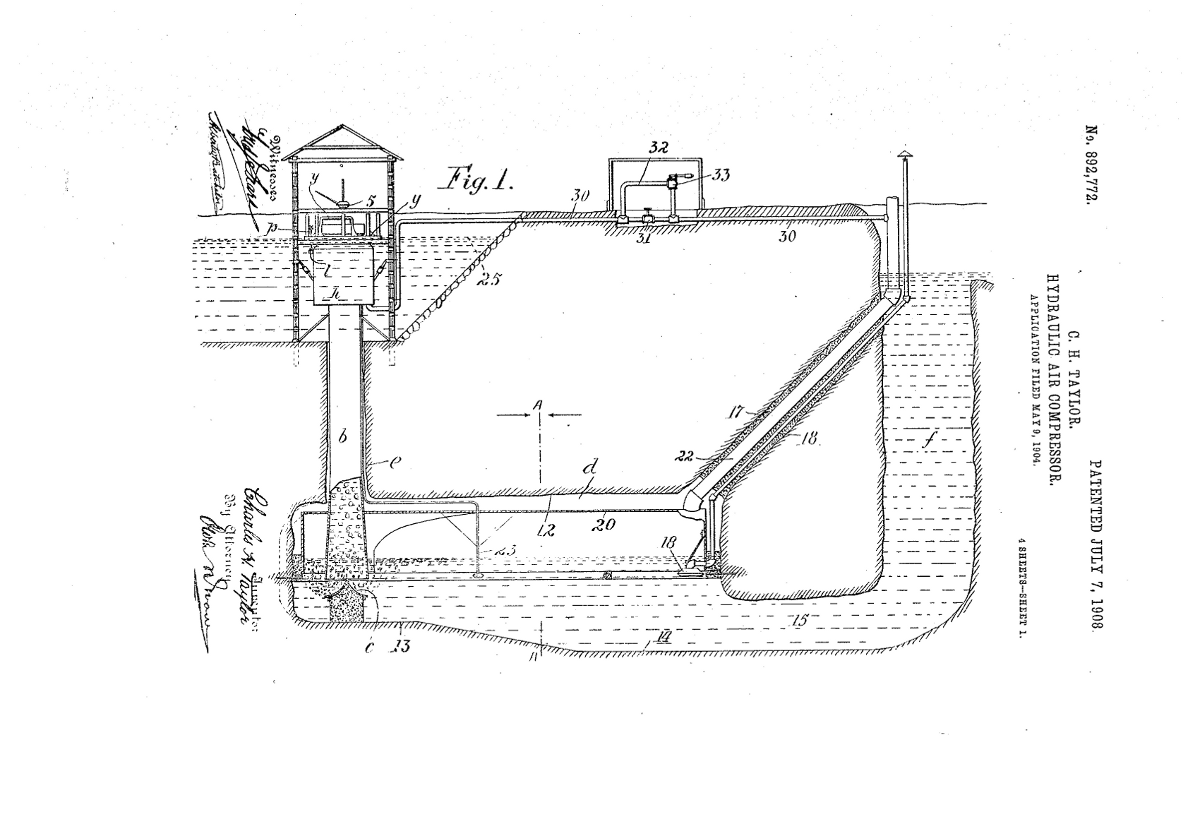 >этой системы нужен перепад воды Перепад нужен для того чтоб вода текла. Если перепада нет, то это не река/ручей, а озеро. Для производительности важен расход воды. На горной речке с уклоном 100 промилле и с расходом 0,1 куб.м/сек производительность будет 50 литров сжатого воздуха(например, от фонаря). А на равнинной же речке с уклоном 0,5 промилле и расходом 2 куб.м/сек производительность будет уже 1000 литров сжатого воздуха(если размеры устройства позволят)