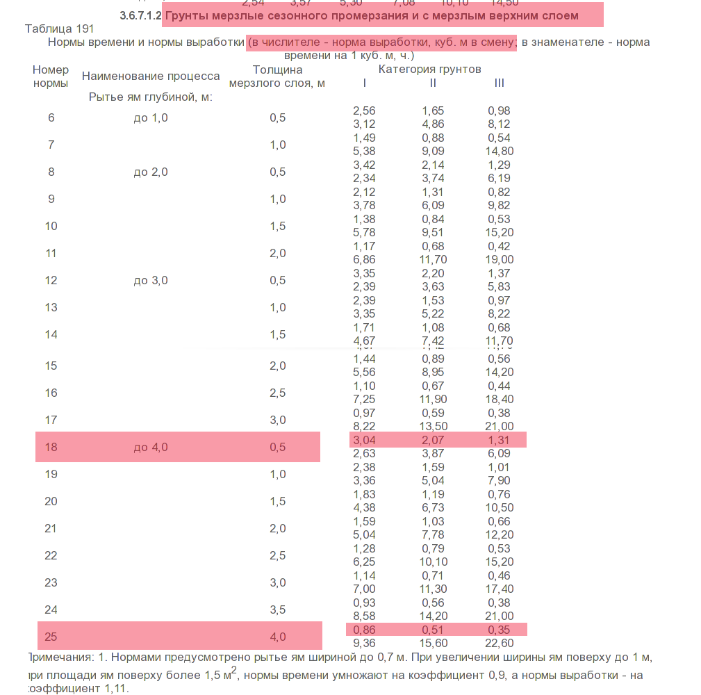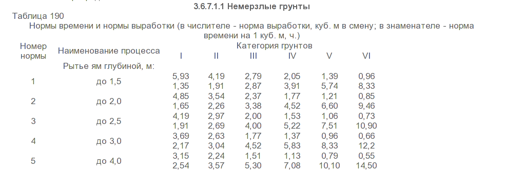 И для иллюстрации возьму грунты I категории , примерно. Норма для 1,5 метров 5,93 куб/смену против 0,96 куб./смену в тяжких грунтов. 5,93/0,96 = 6,18 раз. Значит 25,05/6 = 4,18 смен по 8 часов. За такой срок нужно выкопать колодец той же глубины в легком грунте.