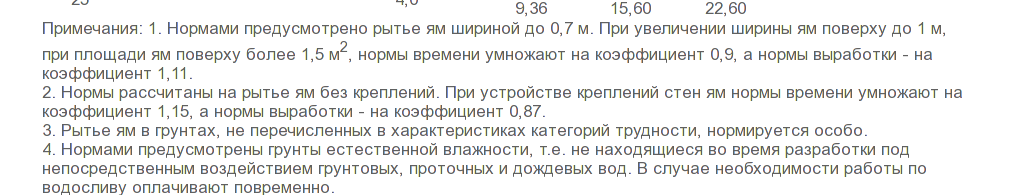 Значит до глубины 1,5 метра (это объем 3,4 куба) надо копать 0,96 куб/смену. НО1: из примеч. 1(пик3) следует, что размер нестандартный и 0,96х1,11 = 1,06 куб/смена. НО2: из прим. 2(пик3) следует, что при устройстве креплений норма выработки умнож на коэф. 0,87 и значит 1,06х0,87 = 0,93 куб./смена.