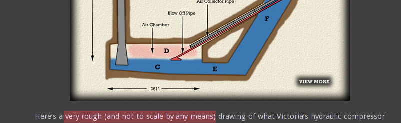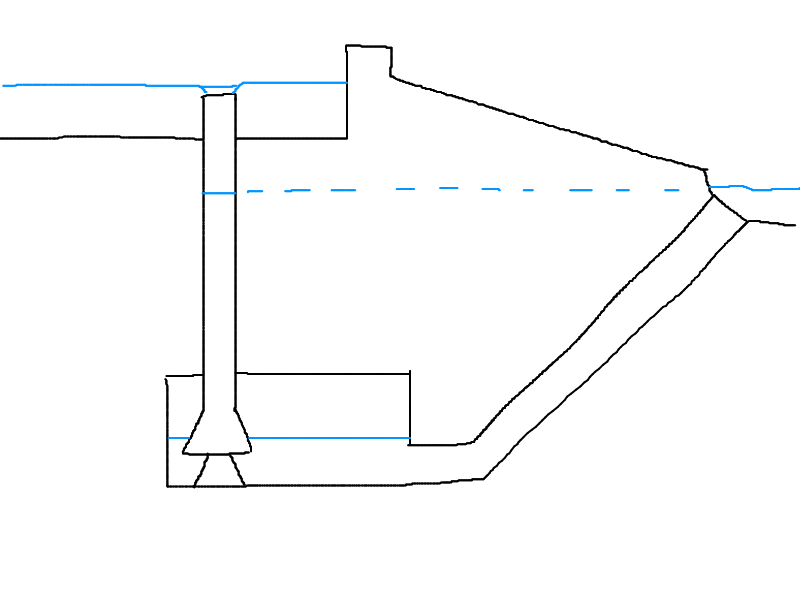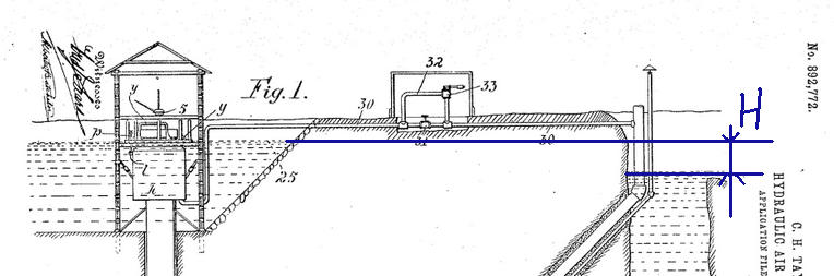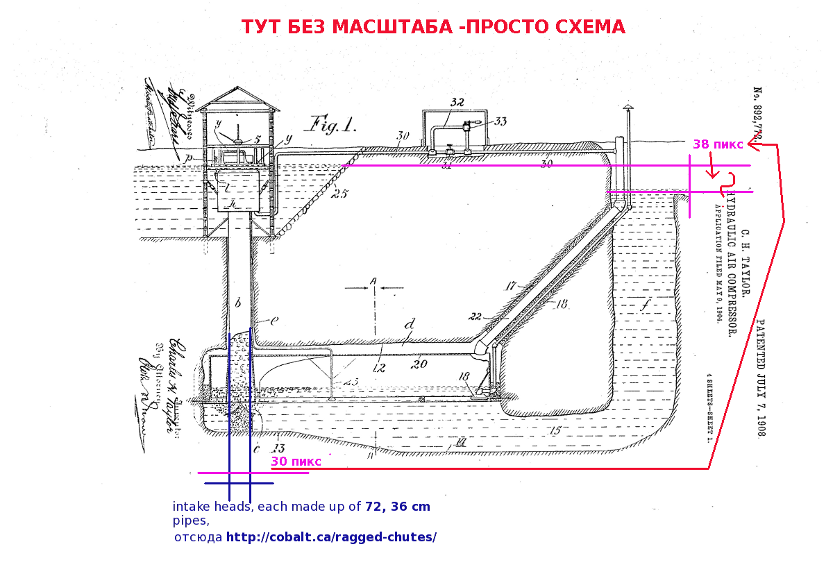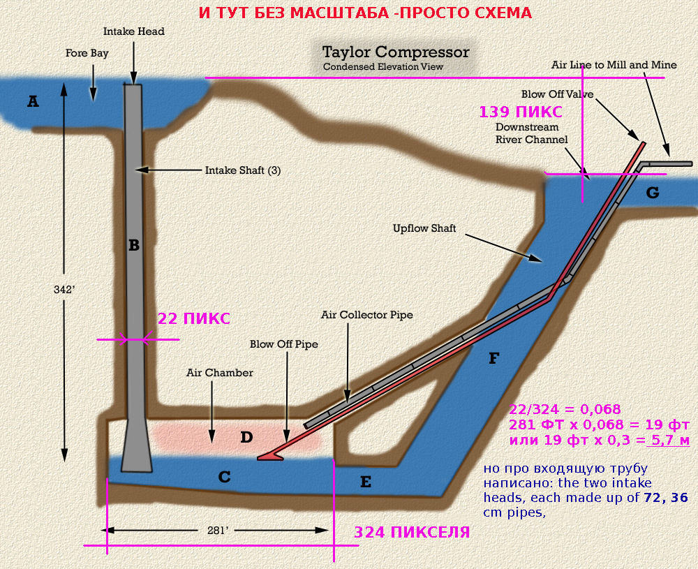 Чем эта система хороша? Тем что для ее работы не требуется большой перепад высот в реке - она будет работать и а равнинной и на горной реке. А давление в системе обеспечивается столбом воды, т.е. глубиной входящего и выходящего колодцев Для 10атм она составляет ок.100 метров(342 фт =102м). Но пневматический движок не обязательно питать 10 атм - достаточно и половины и даже может 1/10(хотя маловато, думаю) А половину атмосферы обеспечит столб воды высотой 5 метров.